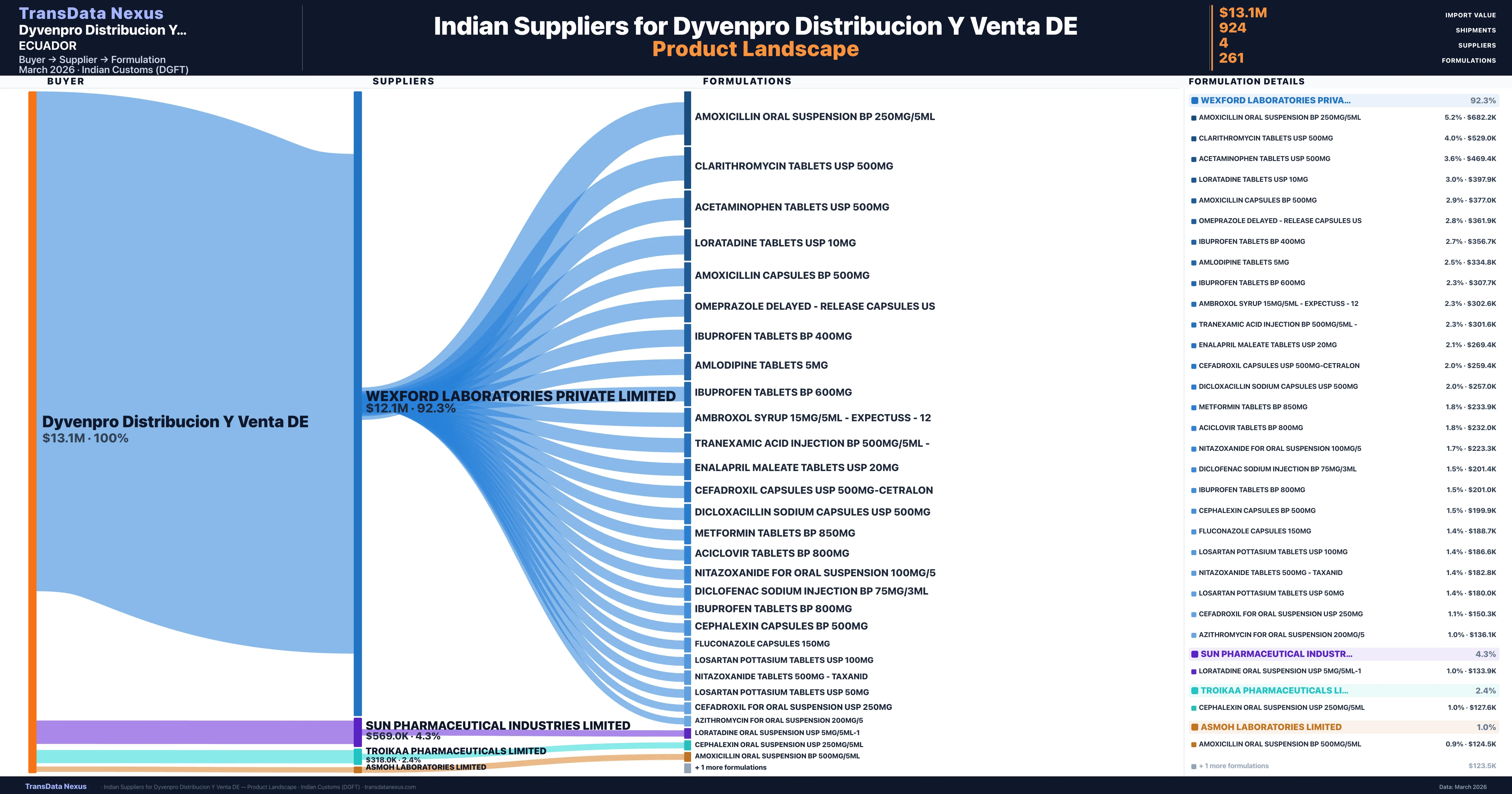 Dyvenpro Distribucion Y Venta DE is a pharmaceutical importer based in Ecuador with a total trade value of $16.1M across 10 products in 6 therapeutic categories. Based on 344 verified import shipments from Indian Customs (DGFT) records, Dyvenpro Distribucion Y Venta DE is the #1 buyer in 1 product including Ambroxol. Dyvenpro Distribucion Y Venta DE sources from 4 verified Indian suppliers, with Wexford Laboratories Private Limited accounting for 92.3% of imports.