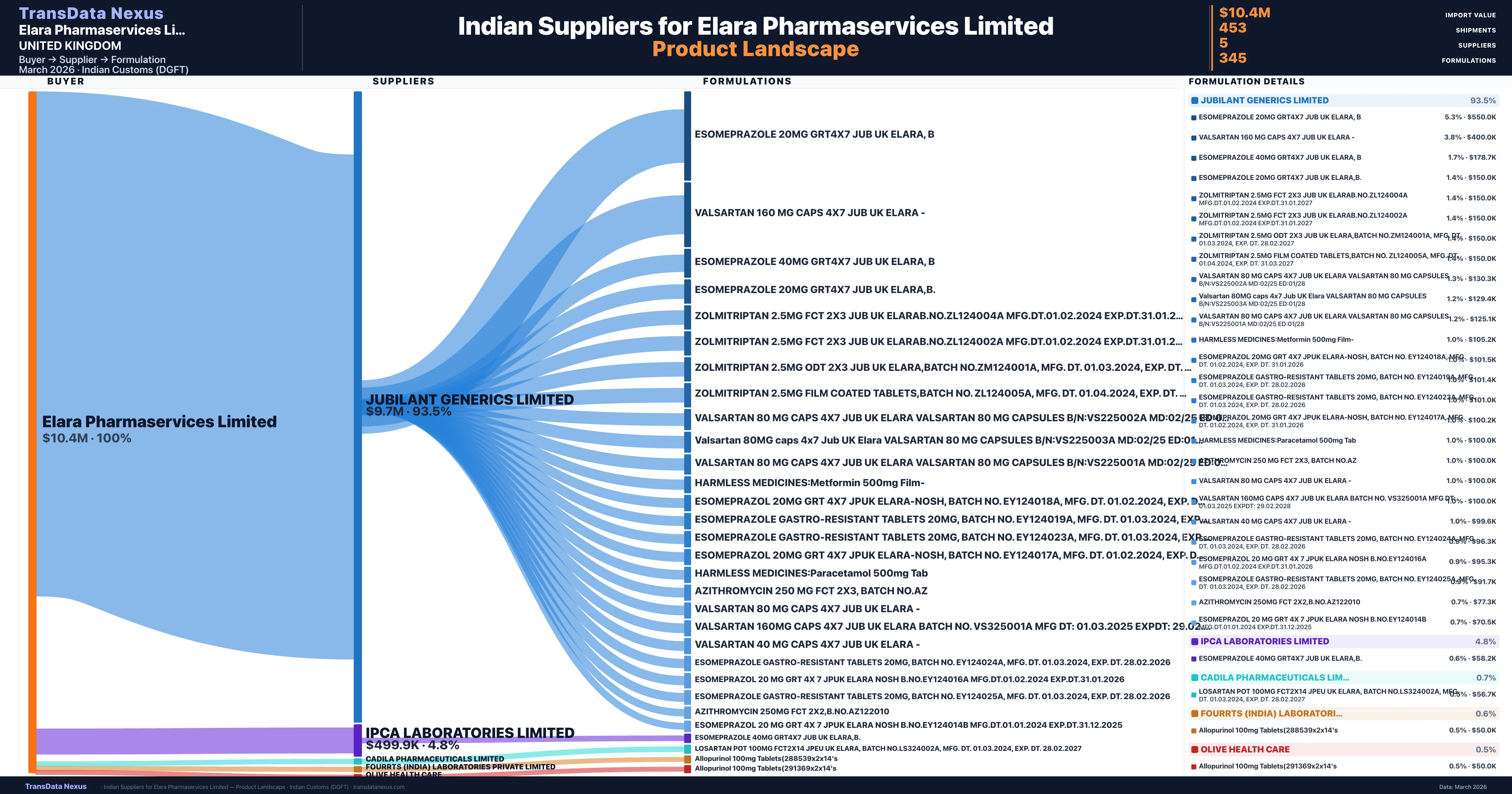 Elara Pharmaservices Limited sources from 5 verified Indian suppliers across 345 distinct formulations. The sourcing is highly concentrated — Jubilant Generics Limited accounts for 93.5% of total imports, indicating a strategic single-source relationship.