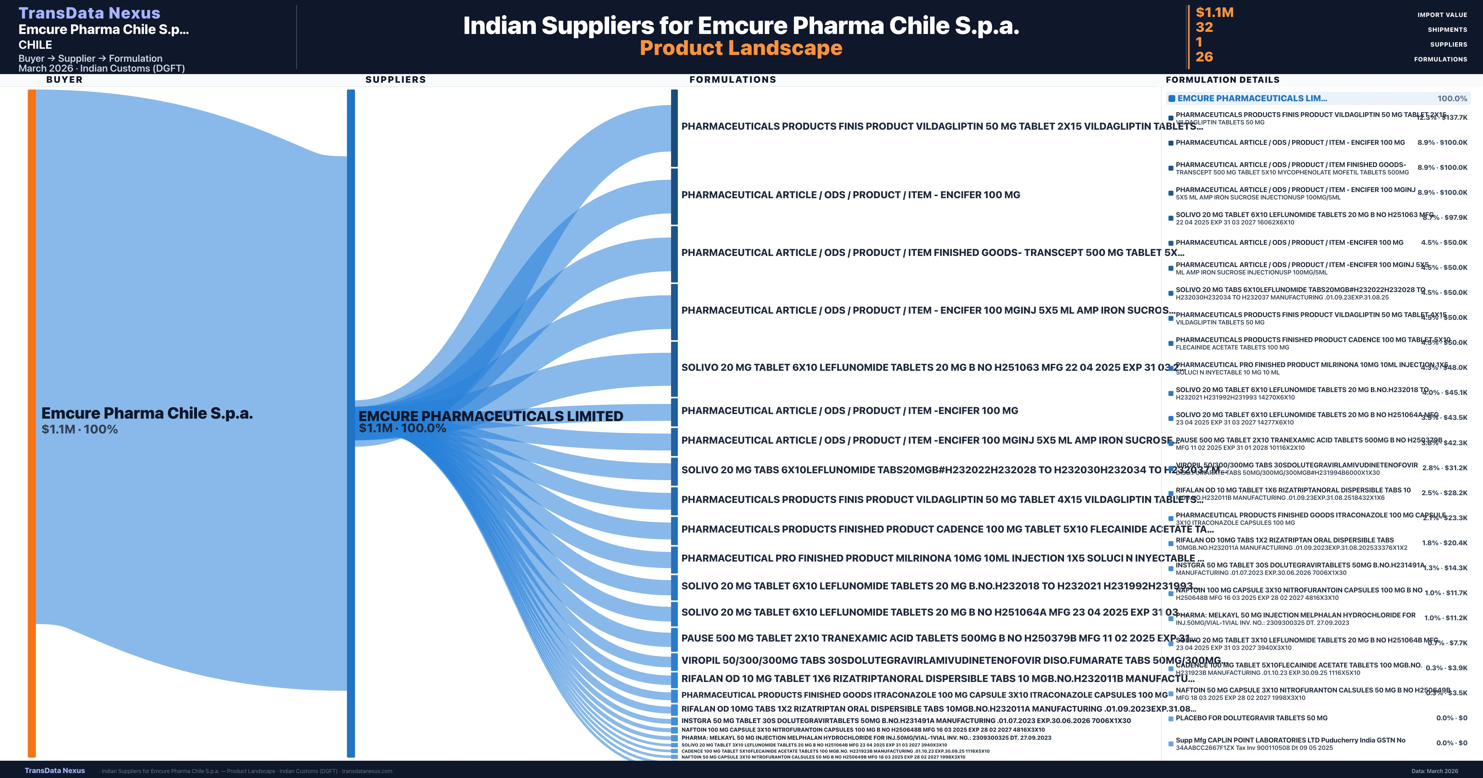 - 5.Supplier Verification: Emcure Pharma Chile S.p.a. sources from 1 verified Indian suppliers across 26 formulations, confirmed from customs records.