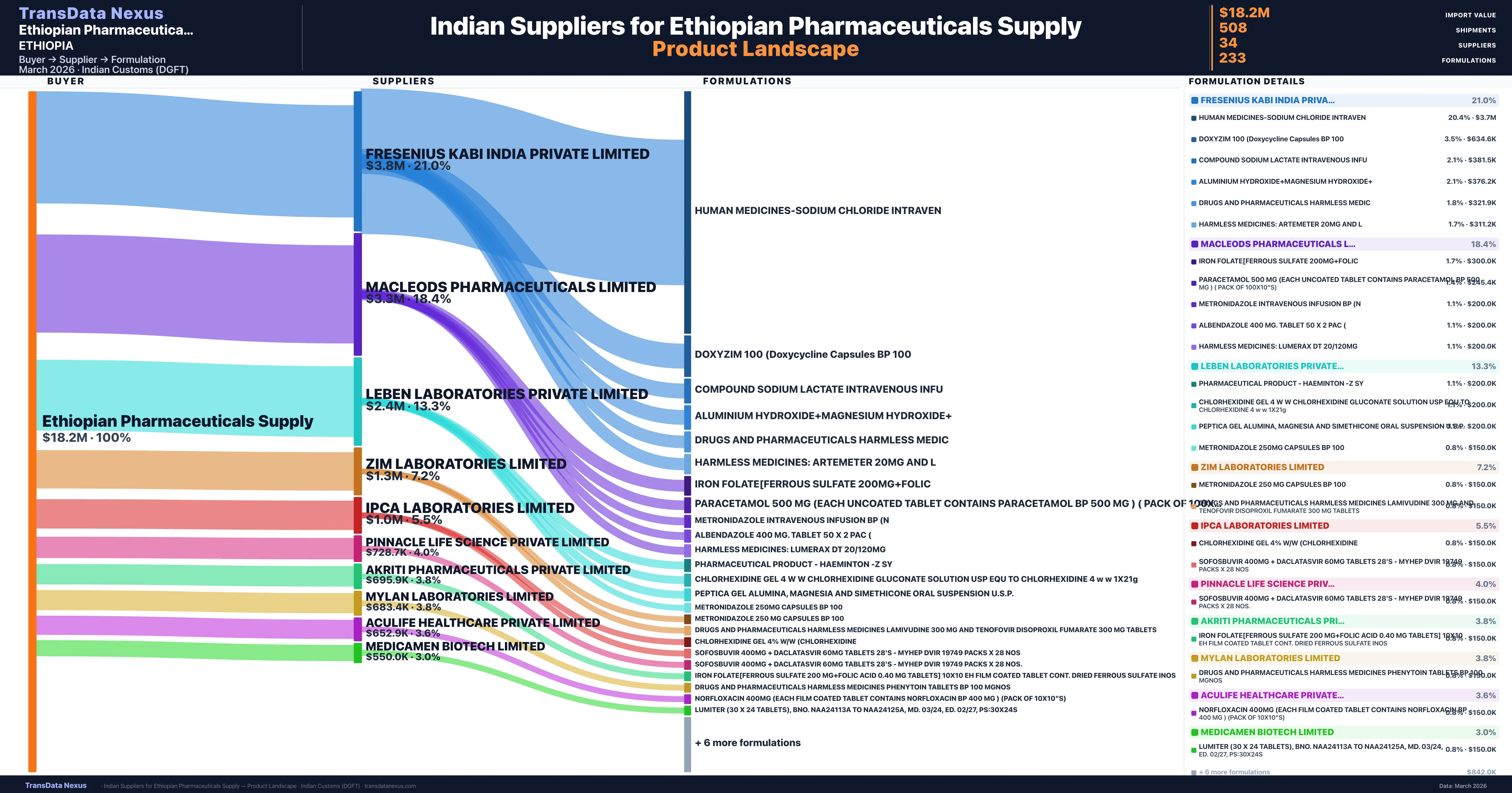 Ethiopian Pharmaceuticals Supply sources from 34 verified Indian suppliers. The primary supplier is Fresenius Kabi India Private Limited (21.0% of imports, $3.8M).