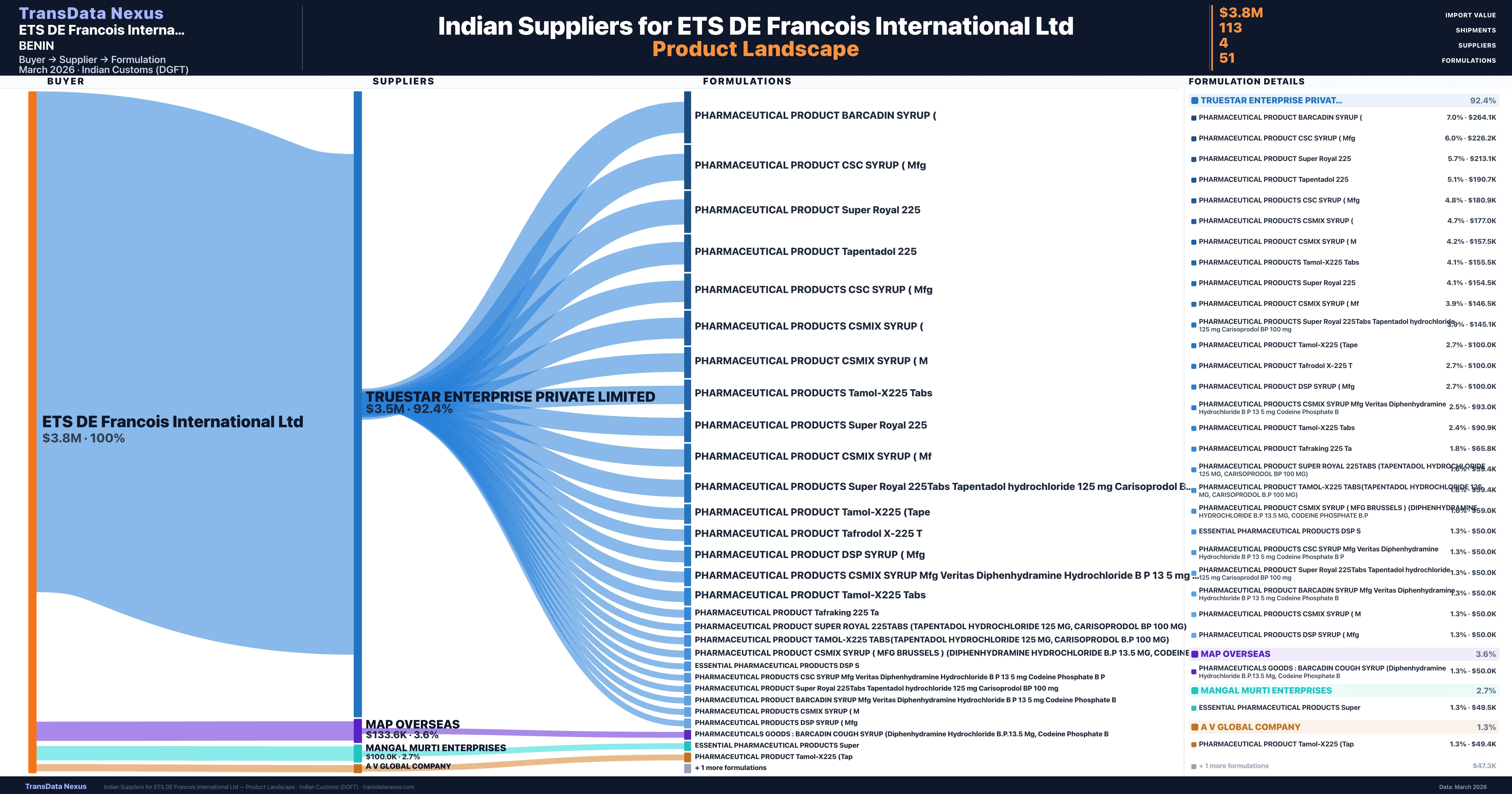 ETS DE Francois International Ltd is a pharmaceutical importer based in Benin with a total trade value of $1.1M across 2 products in 2 therapeutic categories. Based on 36 verified import shipments from Indian Customs (DGFT) records, the company actively imports across multiple product segments. ETS DE Francois International Ltd sources from 4 verified Indian suppliers, with Truestar Enterprise Private Limited accounting for 92.4% of imports.