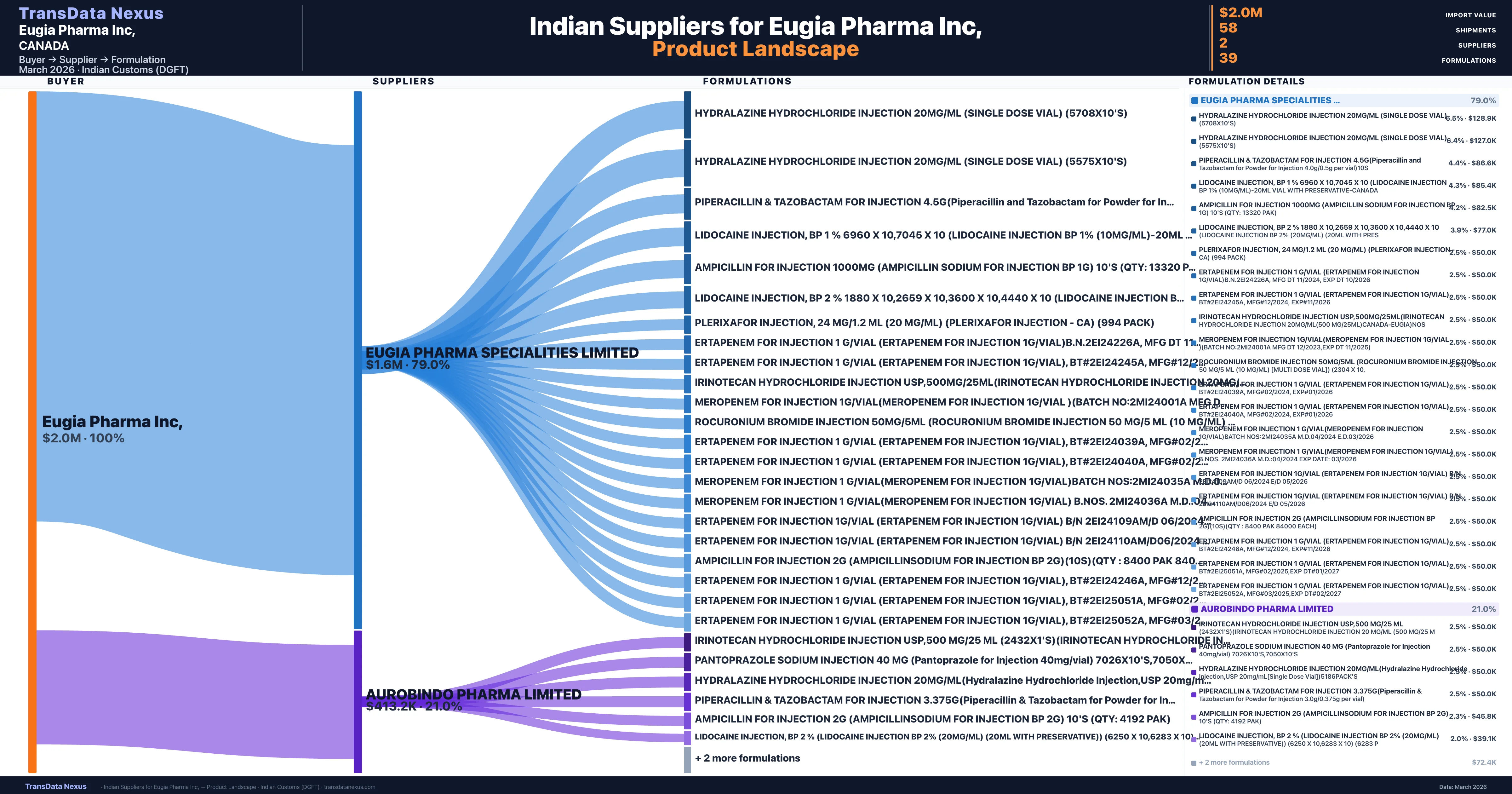 Eugia Pharma Inc, sources from 2 verified Indian suppliers across 39 distinct formulations. Total import value: $2.0M across 58 shipments.