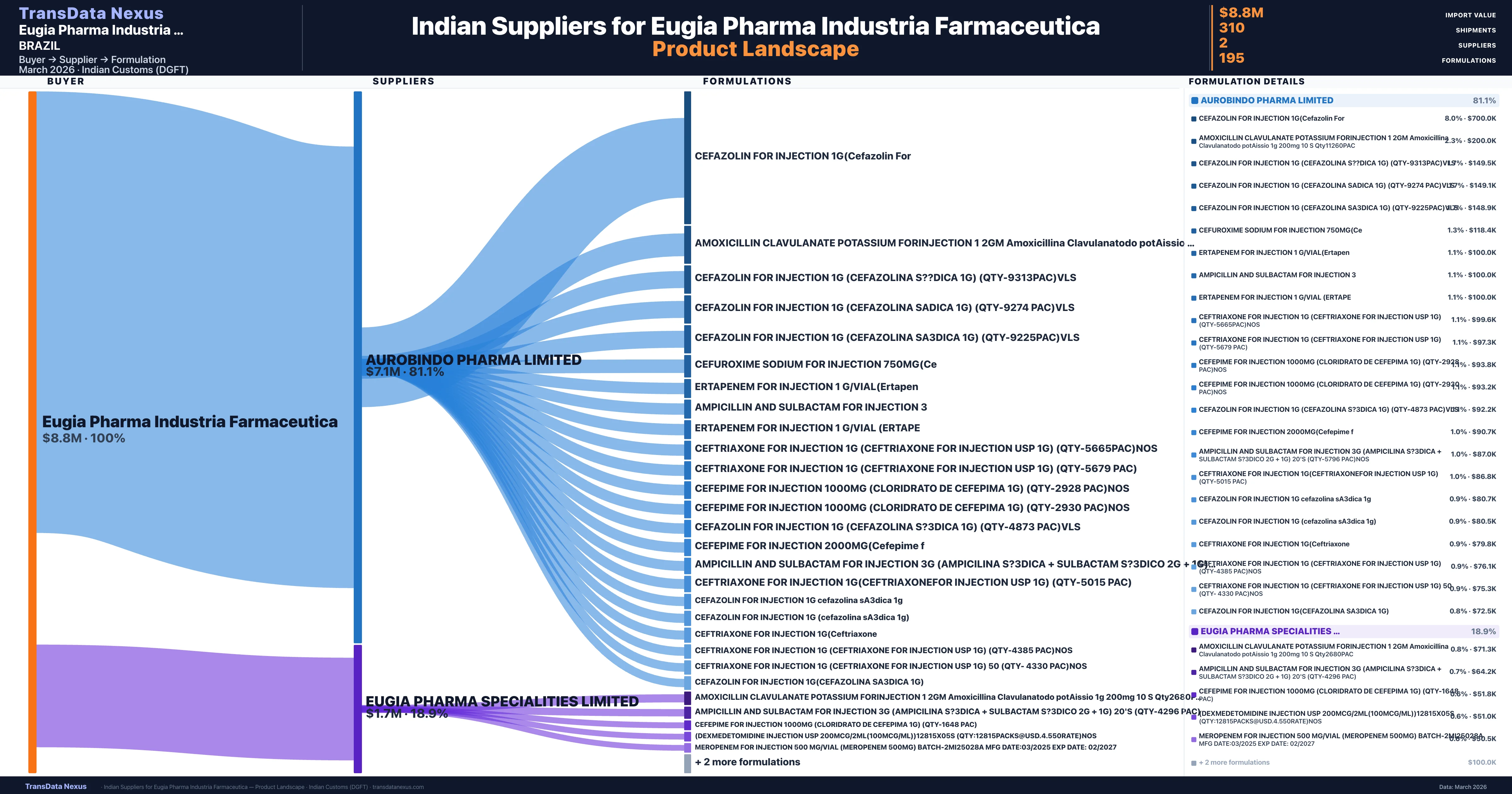 Eugia Pharma Industria Farmaceutica sources from 2 verified Indian suppliers across 195 distinct formulations. The sourcing is highly concentrated — Aurobindo Pharma Limited accounts for 81.1% of total imports, indicating a strategic single-source relationship.