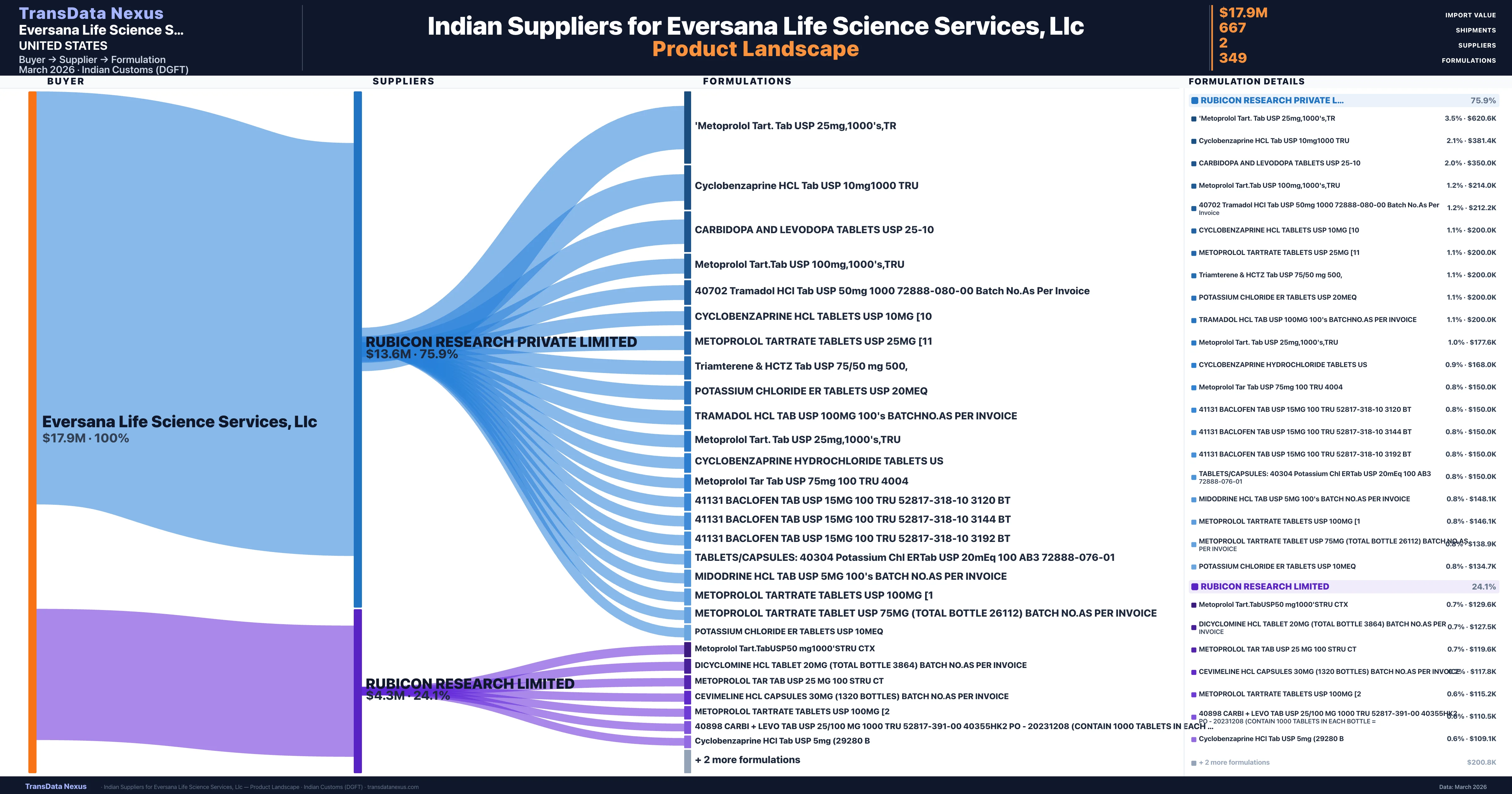 Eversana Life Science Services, Llc sources from 2 verified Indian suppliers across 349 distinct formulations. Total import value: $17.9M across 667 shipments.