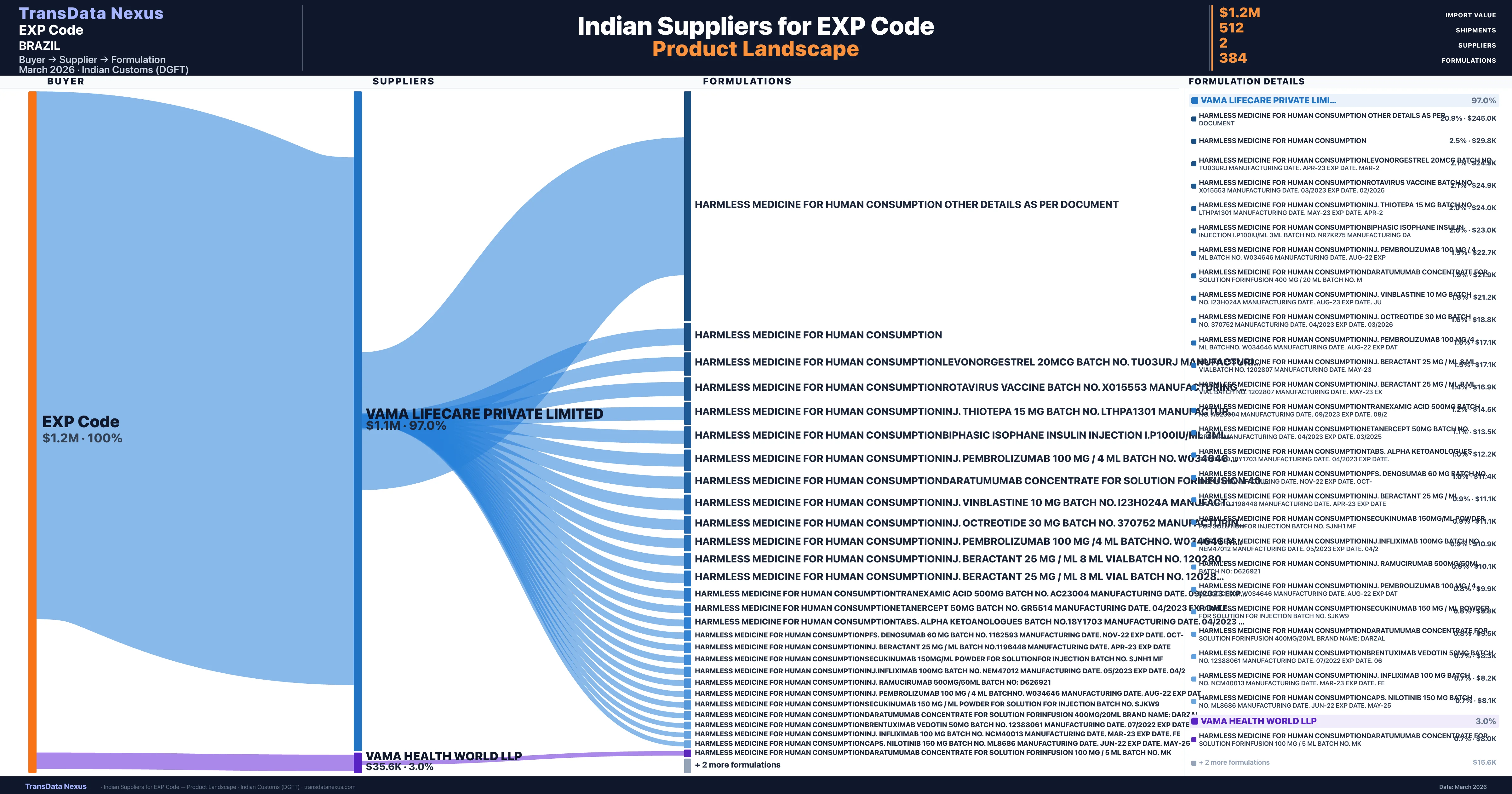 EXP Code is a pharmaceutical importer based in Brazil with a total trade value of $137.5K across 4 products in 2 therapeutic categories. Based on 30 verified import shipments from Indian Customs (DGFT) records, the company actively imports across multiple product segments. EXP Code sources from 2 verified Indian suppliers, with Vama Lifecare Private Limited accounting for 97.0% of imports.