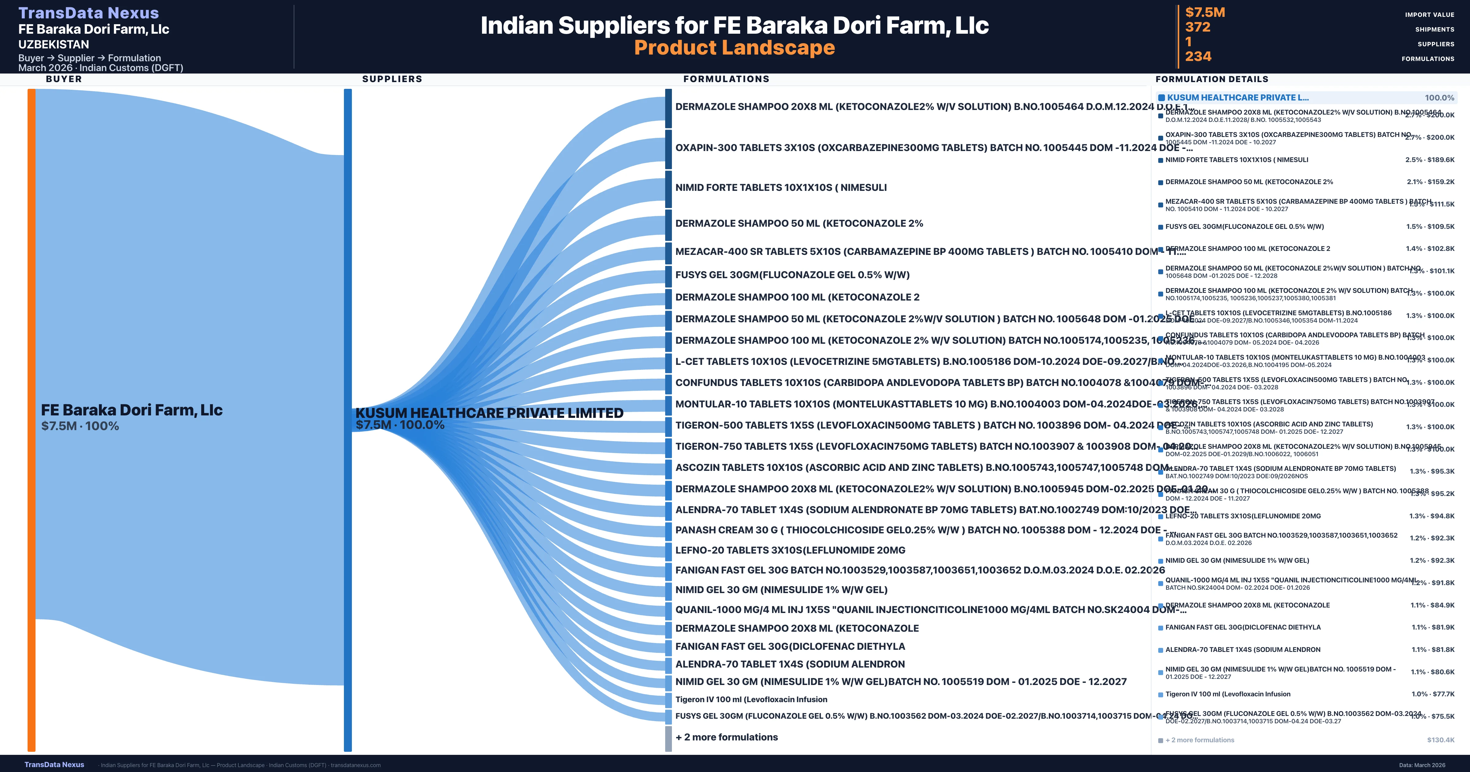 The concentrated sourcing pattern positions FE Baraka Dori Farm as a specialized distributor of specific pharmaceutical products within Uzbekistan. For Indian exporters, this presents an opportunity to establish a strong partnership by meeting the company's specific product requirements and quality standards. However, potential suppliers should be prepared to meet the demands of a single-source relationship, which may include higher volumes and stringent compliance with regulatory standards.