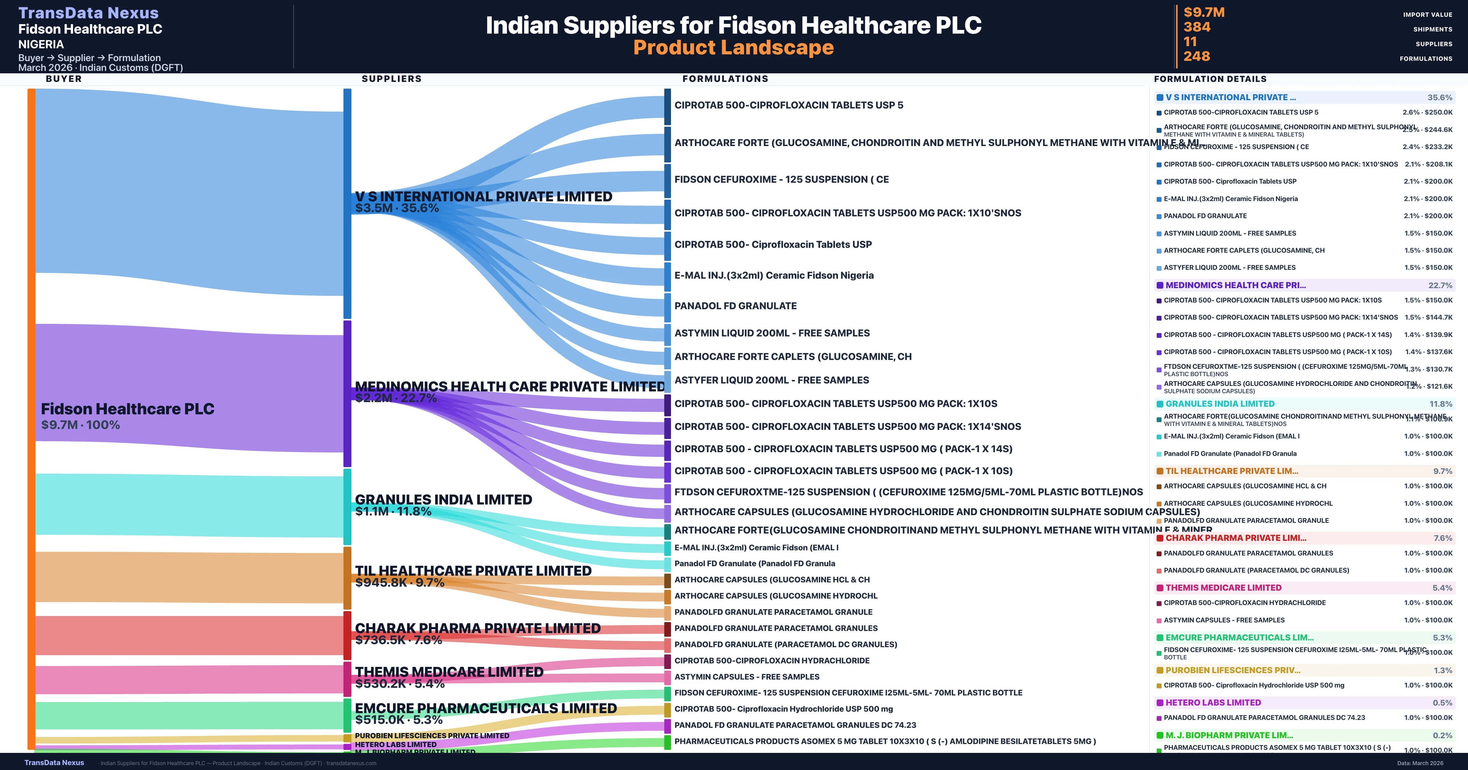 - 5.Supplier Verification: Fidson Healthcare PLC sources from 11 verified Indian suppliers across 248 formulations, confirmed from customs records.