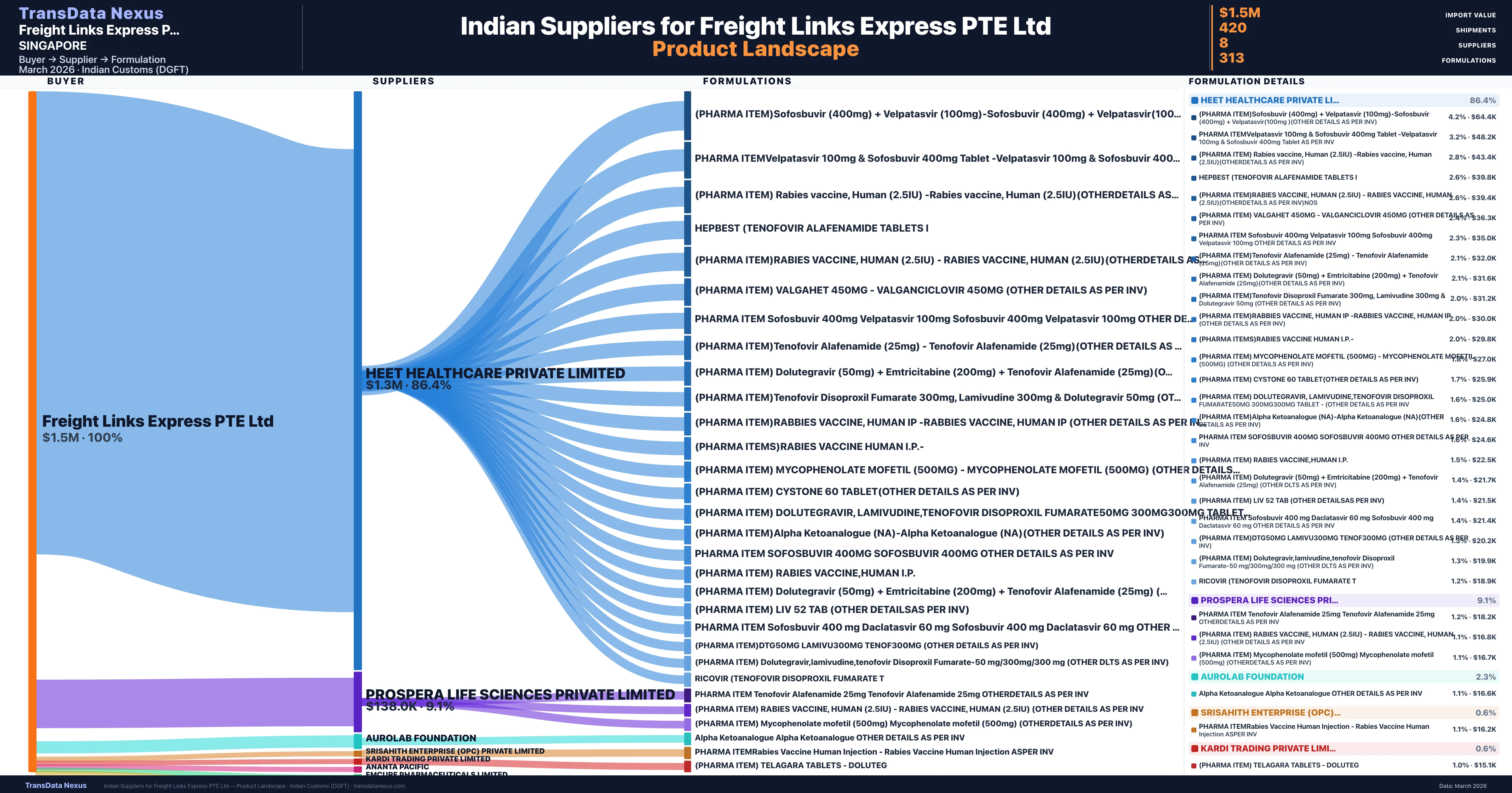 Freight Links Express PTE Ltd is a pharmaceutical importer based in Singapore with a total trade value of $44.0K across 2 products in 1 therapeutic categories. Based on 15 verified import shipments from Indian Customs (DGFT) records, the company actively imports across multiple product segments. Freight Links Express PTE Ltd sources from 8 verified Indian suppliers, with Heet Healthcare Private Limited accounting for 86.4% of imports.