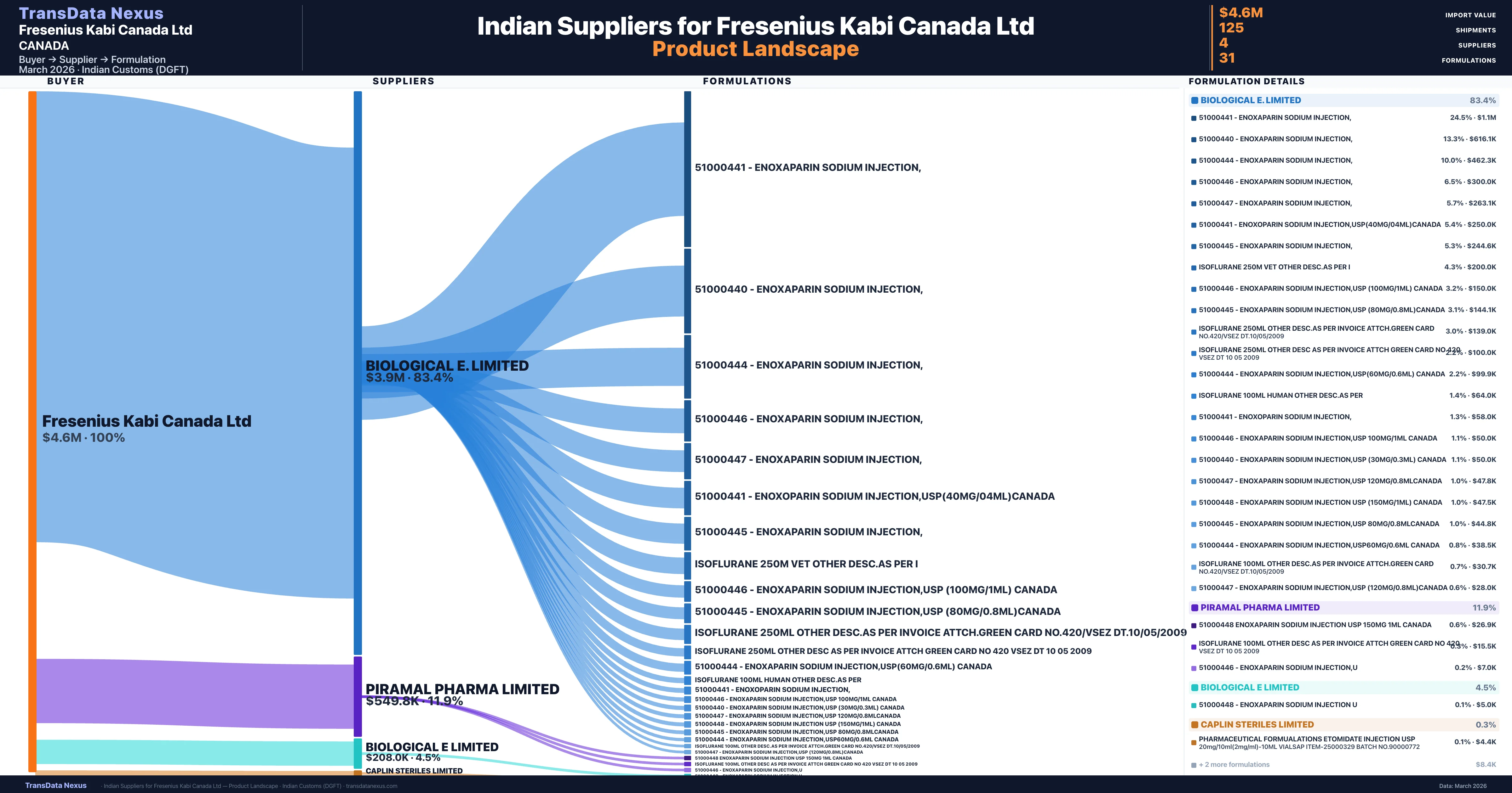 Fresenius Kabi Canada Ltd sources from 4 verified Indian suppliers across 31 distinct formulations. The sourcing is highly concentrated — Biological E. Limited accounts for 83.4% of total imports, indicating a strategic single-source relationship.