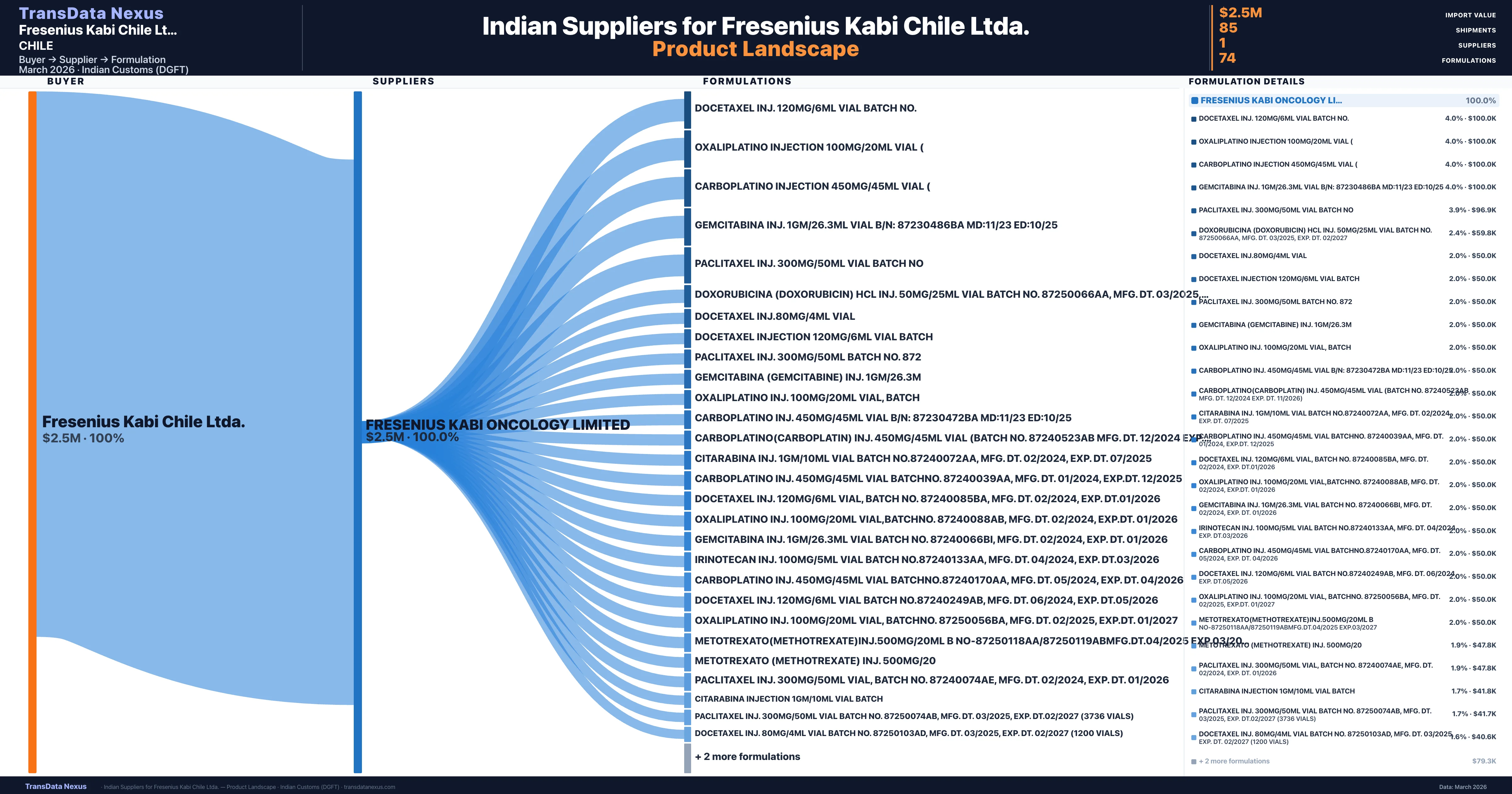 Fresenius Kabi Chile Ltda. sources from 1 verified Indian supplier across 74 distinct formulations. The sourcing is highly concentrated — Fresenius Kabi Oncology Limited accounts for 100.0% of total imports, indicating a strategic single-source relationship.