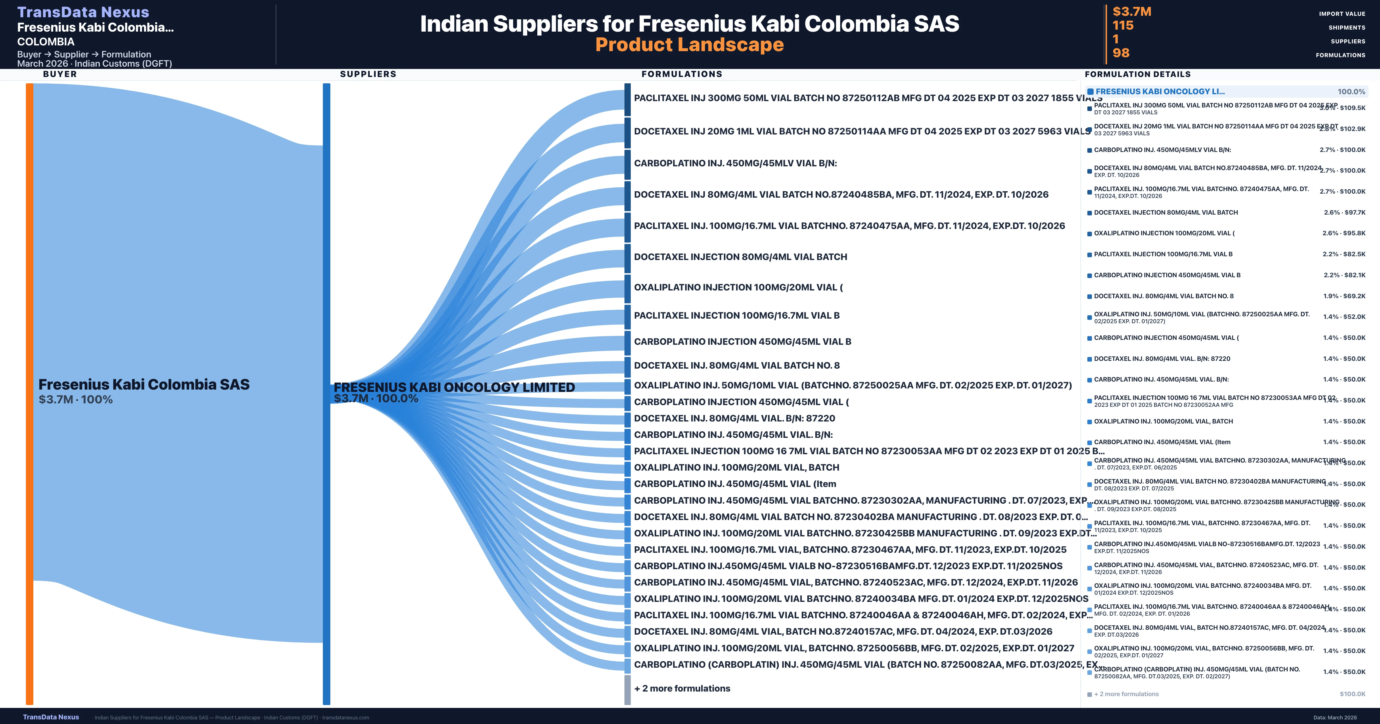 Fresenius Kabi Colombia SAS sources from 1 verified Indian supplier across 98 distinct formulations. The sourcing is highly concentrated — Fresenius Kabi Oncology Limited accounts for 100.0% of total imports, indicating a strategic single-source relationship.
