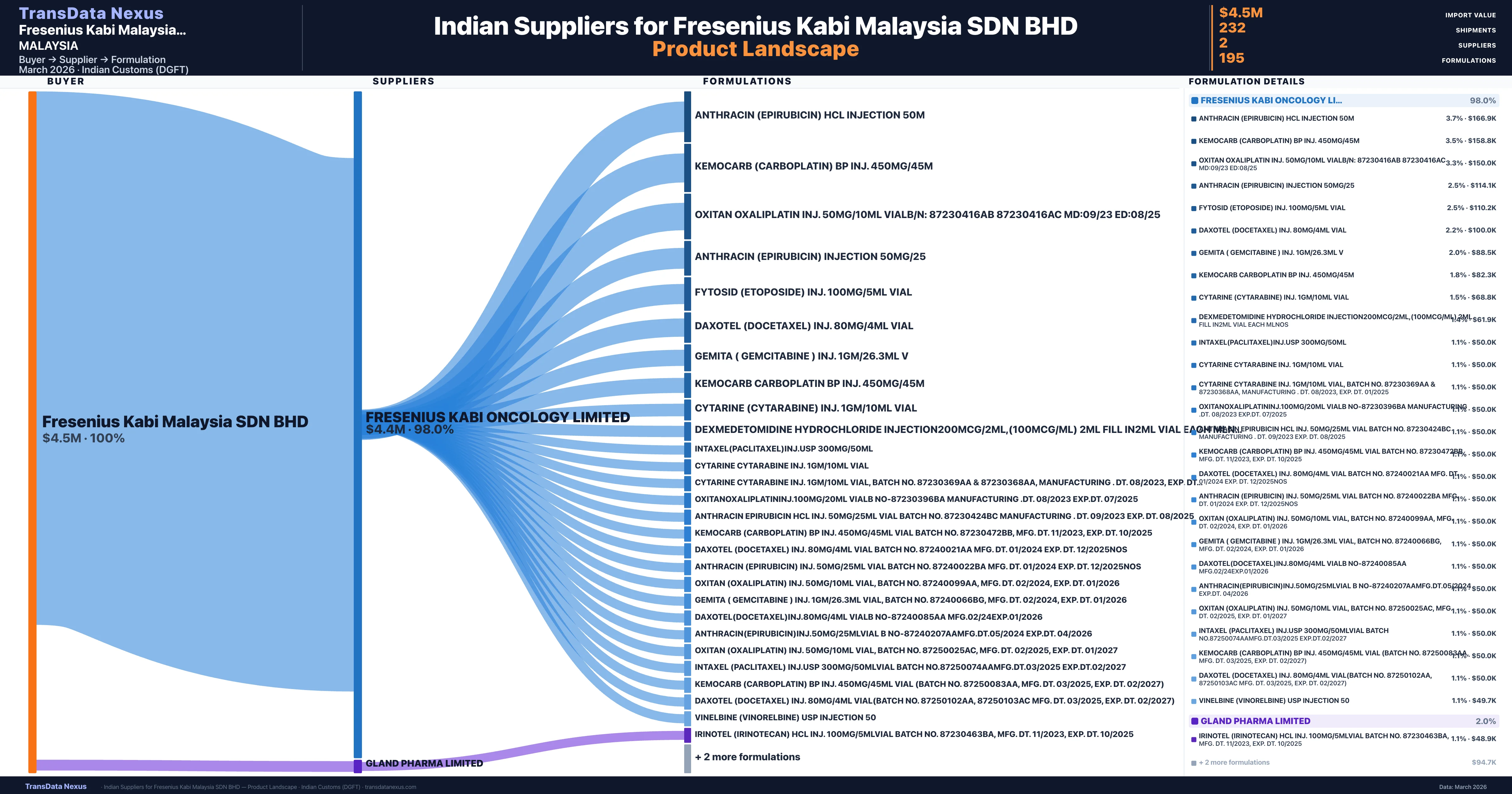 Fresenius Kabi Malaysia SDN BHD sources from 2 verified Indian suppliers across 195 distinct formulations. The sourcing is highly concentrated — Fresenius Kabi Oncology Limited accounts for 98.0% of total imports, indicating a strategic single-source relationship.