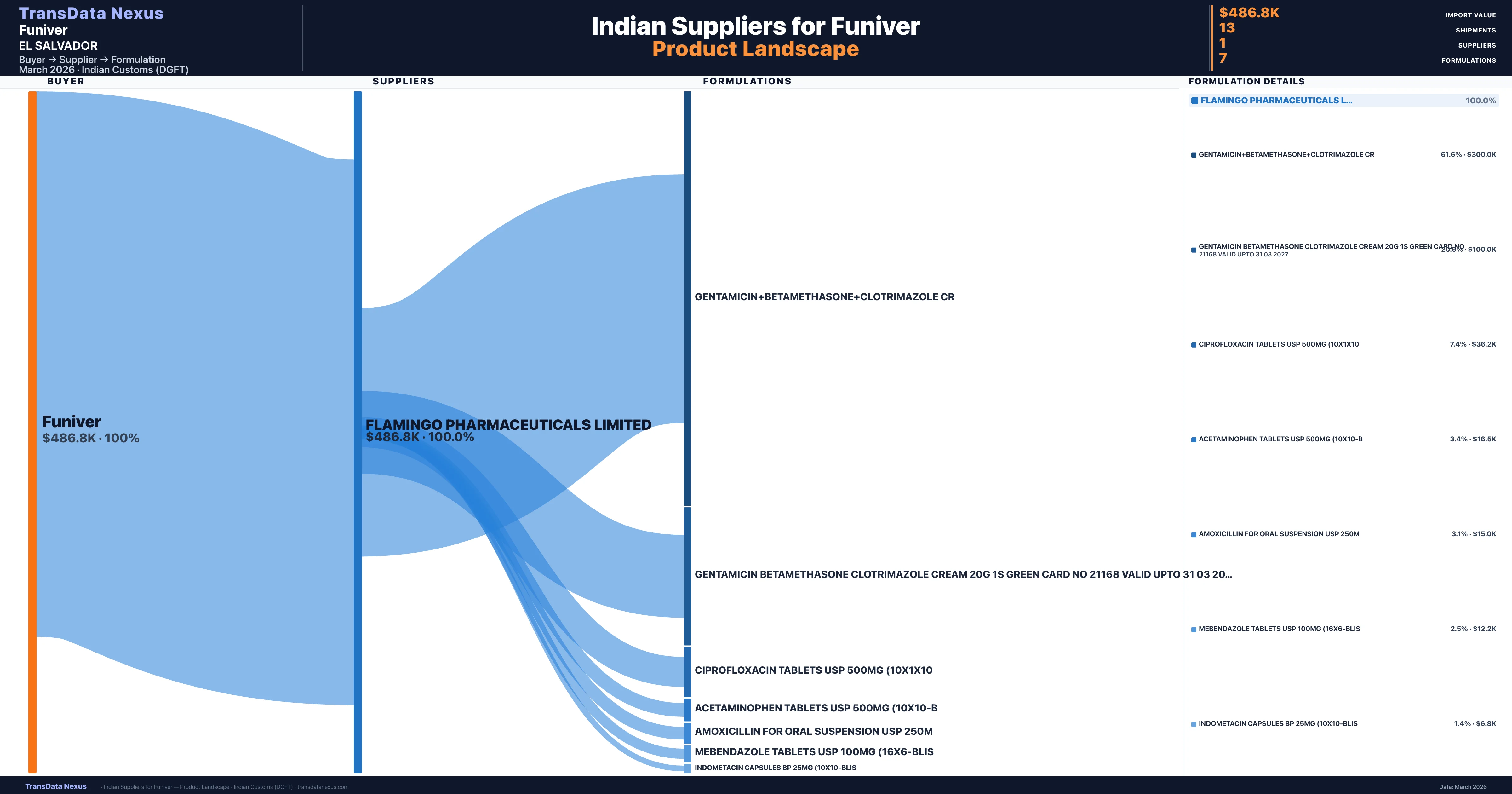 Funiver sources from 1 verified Indian supplier across 7 distinct formulations. The sourcing is highly concentrated — Flamingo Pharmaceuticals Limited accounts for 100.0% of total imports, indicating a strategic single-source relationship.