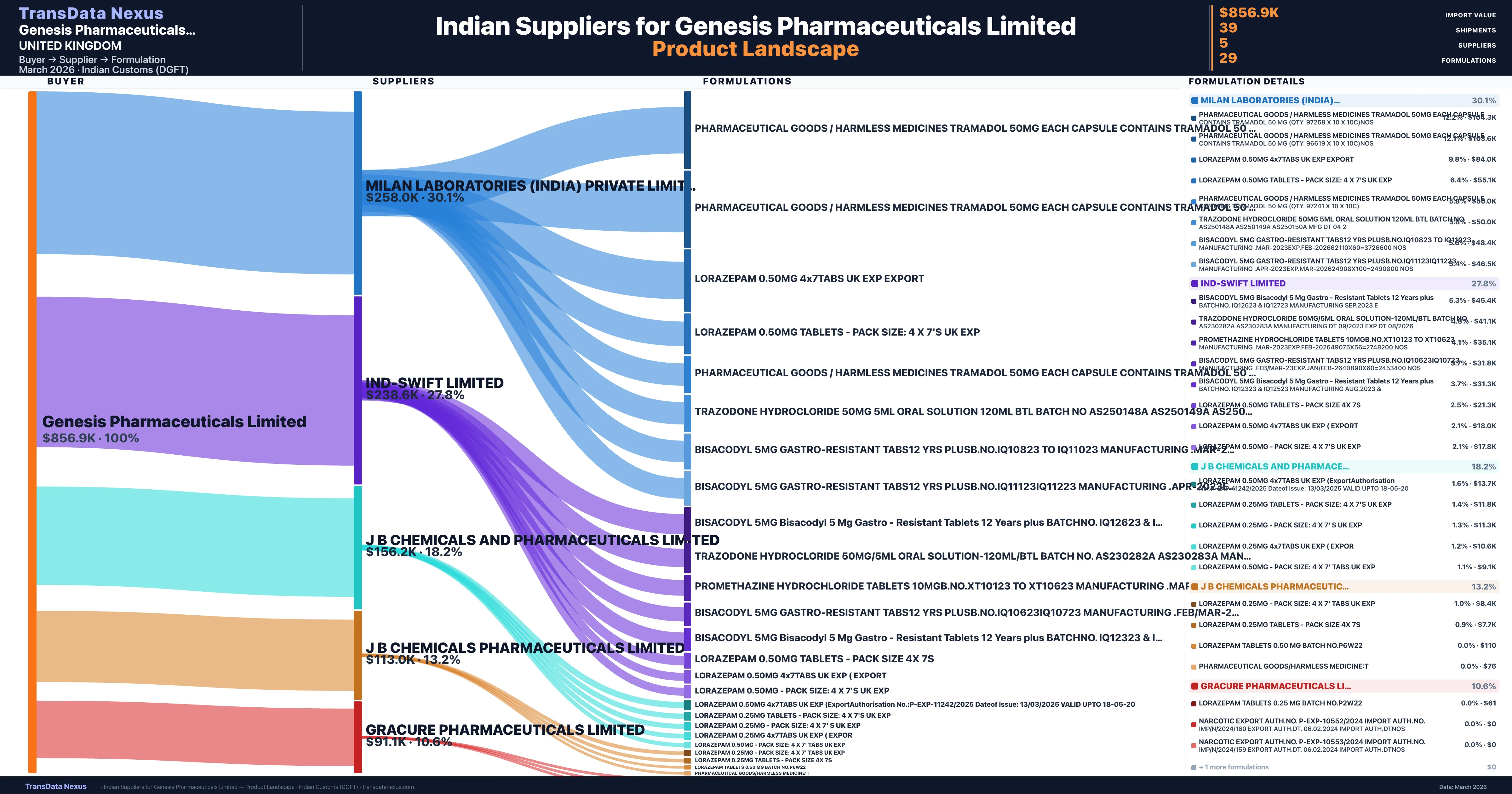 Genesis Pharmaceuticals Limited sources from 5 verified Indian suppliers. The primary supplier is Milan Laboratories (india) Private Limited (30.1% of imports, $258.0K).
