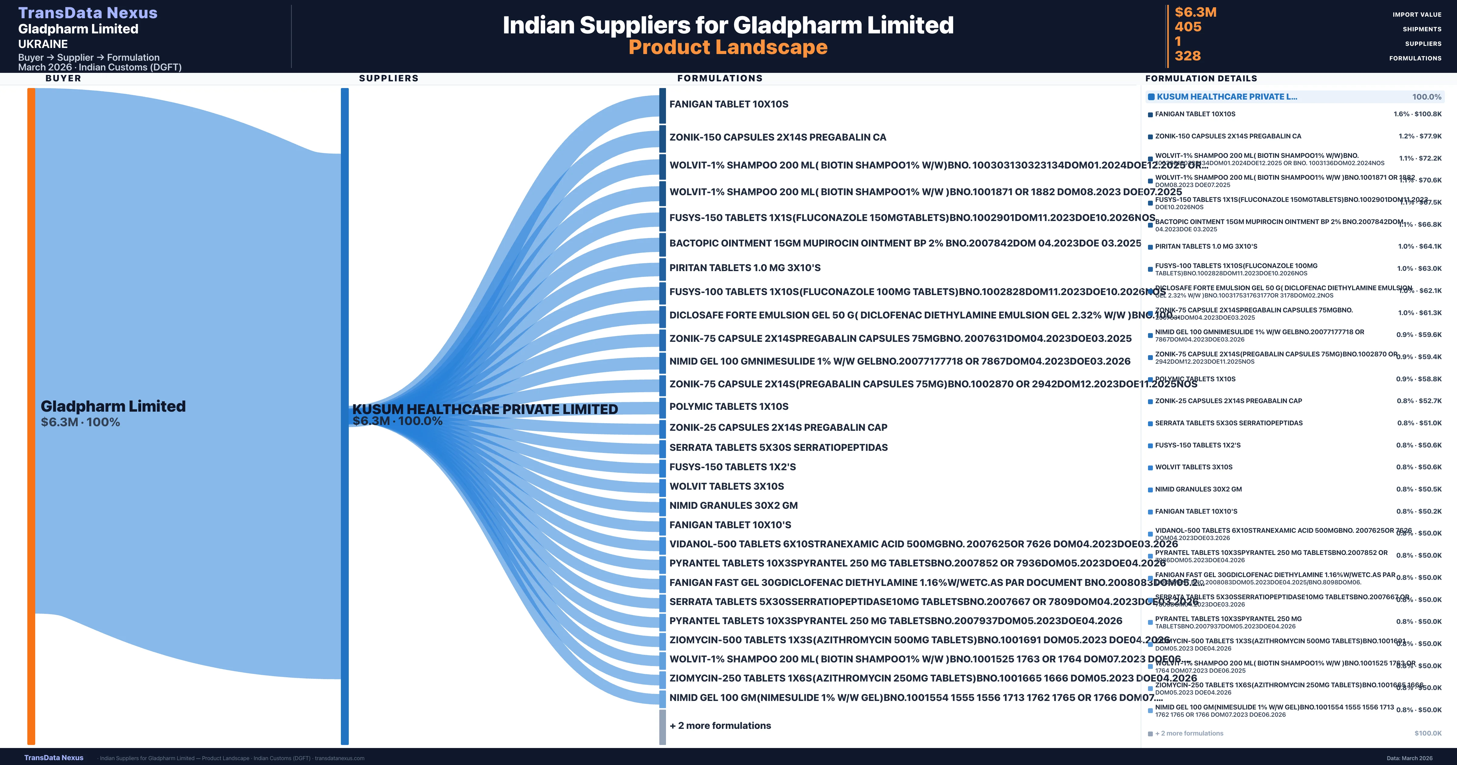 Gladpharm Limited sources from 1 verified Indian supplier across 328 distinct formulations. The sourcing is highly concentrated — Kusum Healthcare Private Limited accounts for 100.0% of total imports, indicating a strategic single-source relationship.
