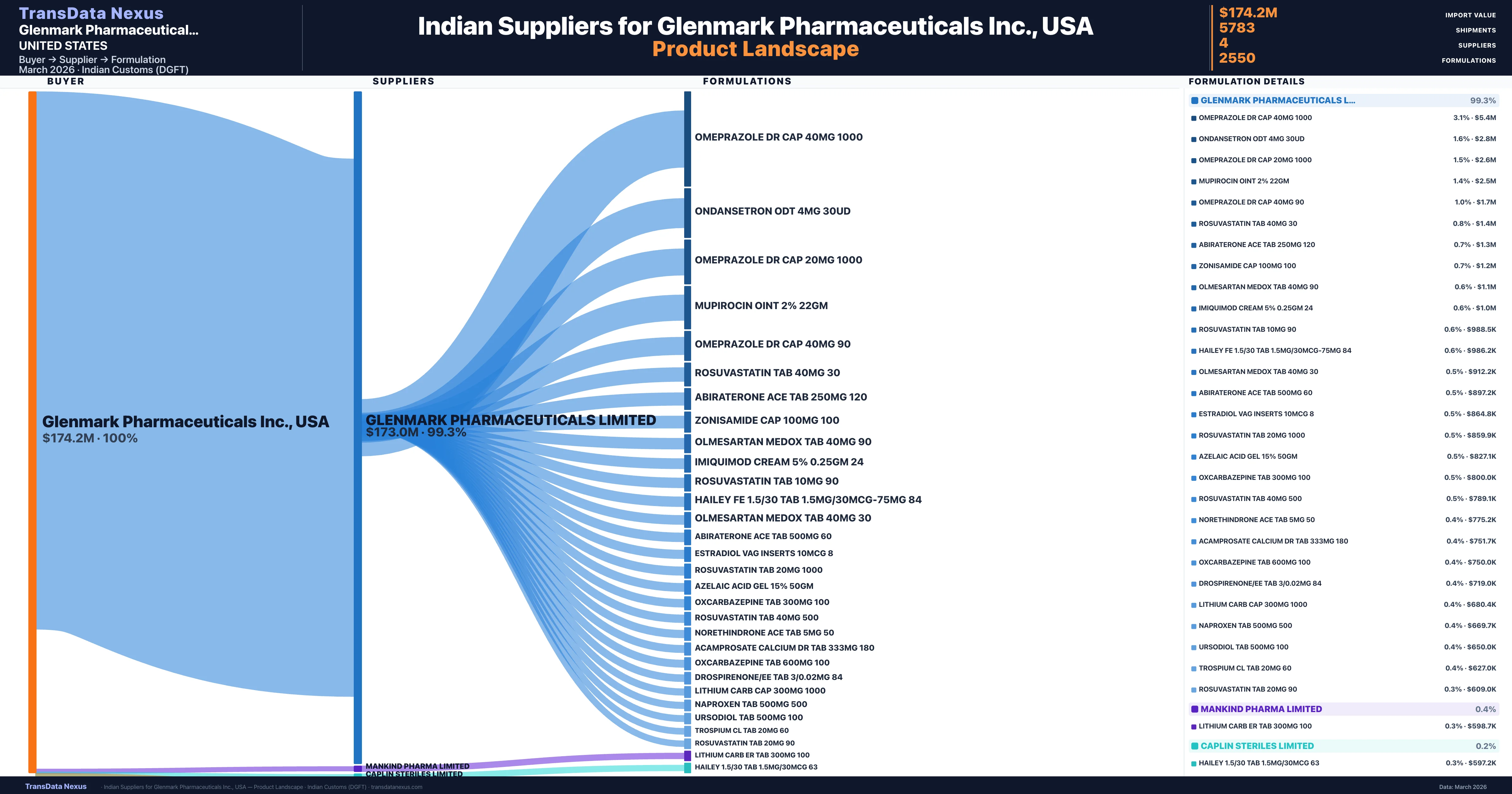 - 5.Supplier Verification: Glenmark Pharmaceuticals Inc., USA sources from 4 verified Indian suppliers across 2,550 formulations, confirmed from customs records.