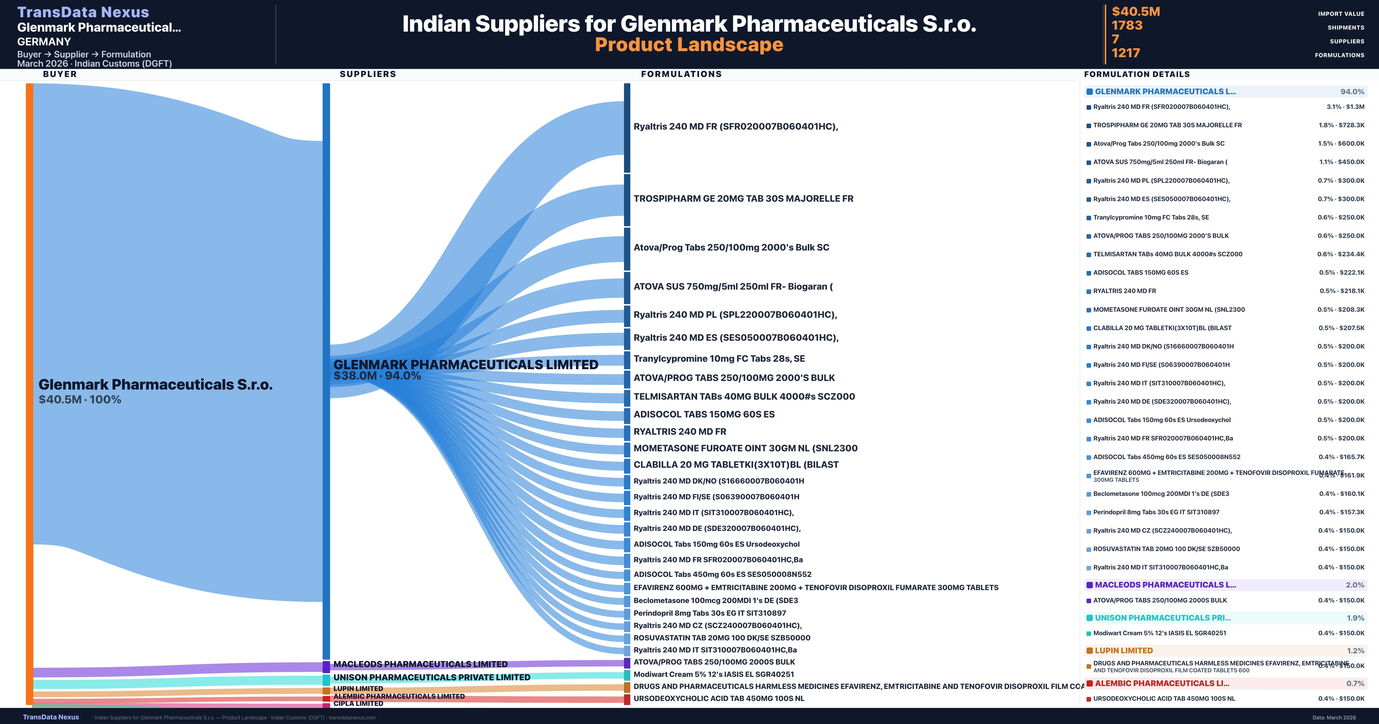 Glenmark Pharmaceuticals S.r.o. sources from 7 verified Indian suppliers across 1,217 distinct formulations. The sourcing is highly concentrated — Glenmark Pharmaceuticals Limited accounts for 94.0% of total imports, indicating a strategic single-source relationship.