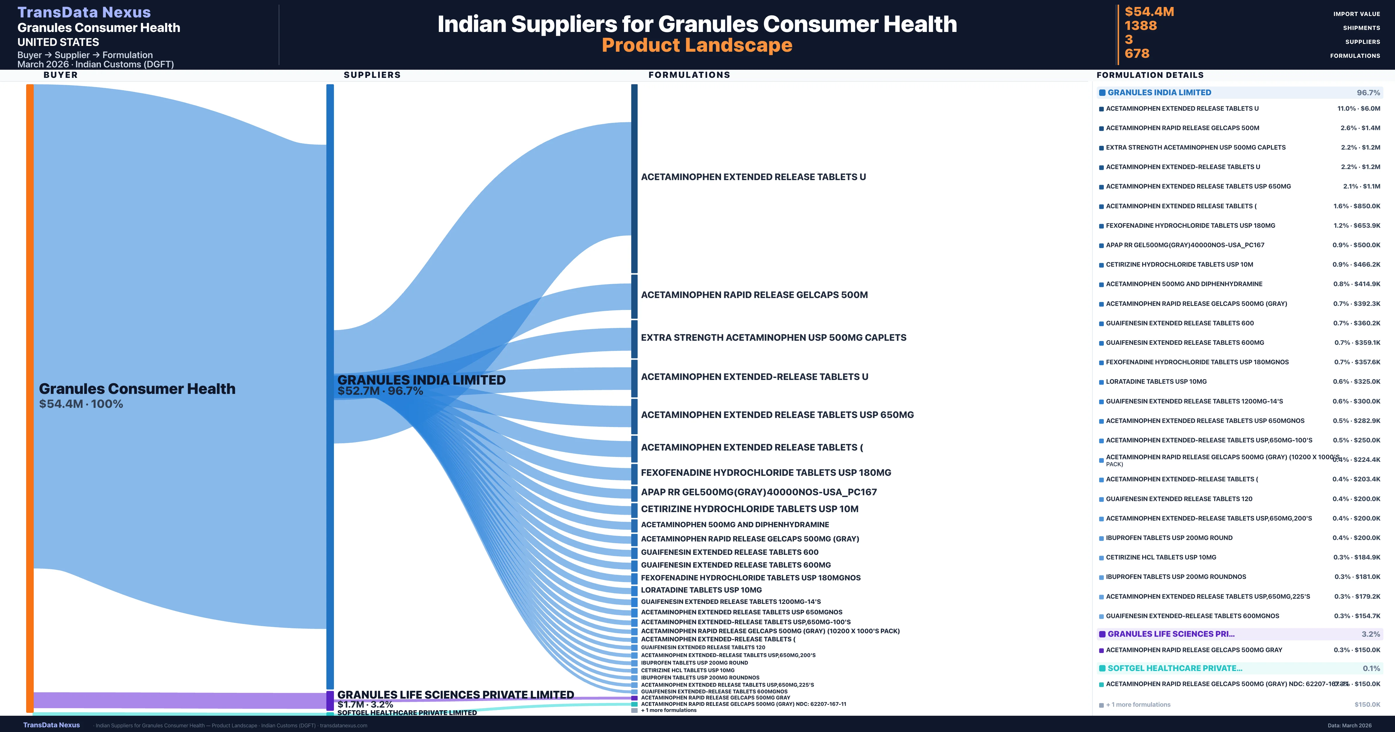 Granules Consumer Health sources from 3 verified Indian suppliers across 678 distinct formulations. The sourcing is highly concentrated — Granules India Limited accounts for 96.7% of total imports, indicating a strategic single-source relationship.