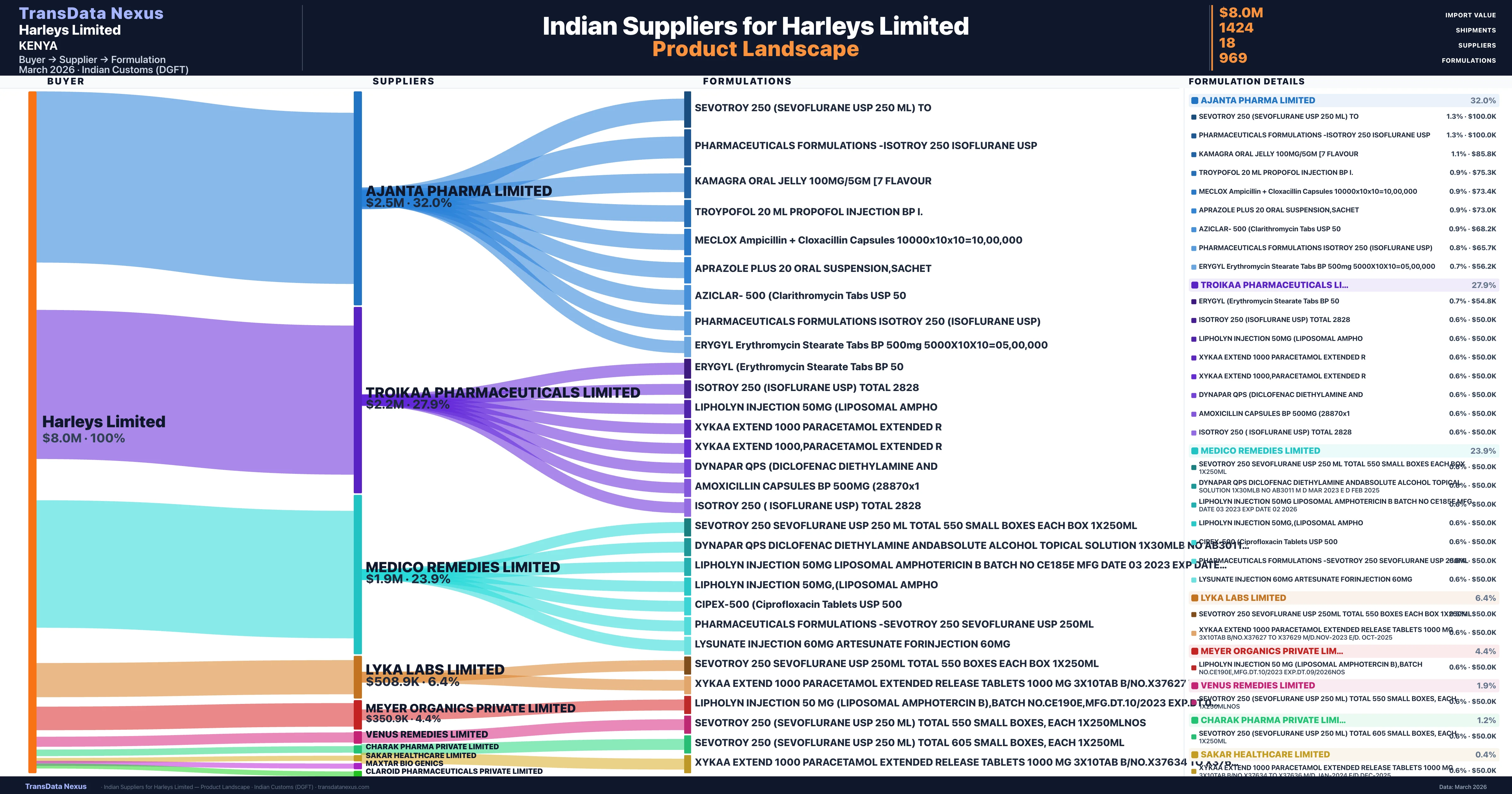 Harleys Limited is a pharmaceutical importer based in Kenya with a total trade value of $174.5K across 3 products in 3 therapeutic categories. Based on 28 verified import shipments from Indian Customs (DGFT) records, the company actively imports across multiple product segments. Harleys Limited sources from 18 verified Indian suppliers, with Ajanta Pharma Limited accounting for 32.0% of imports.