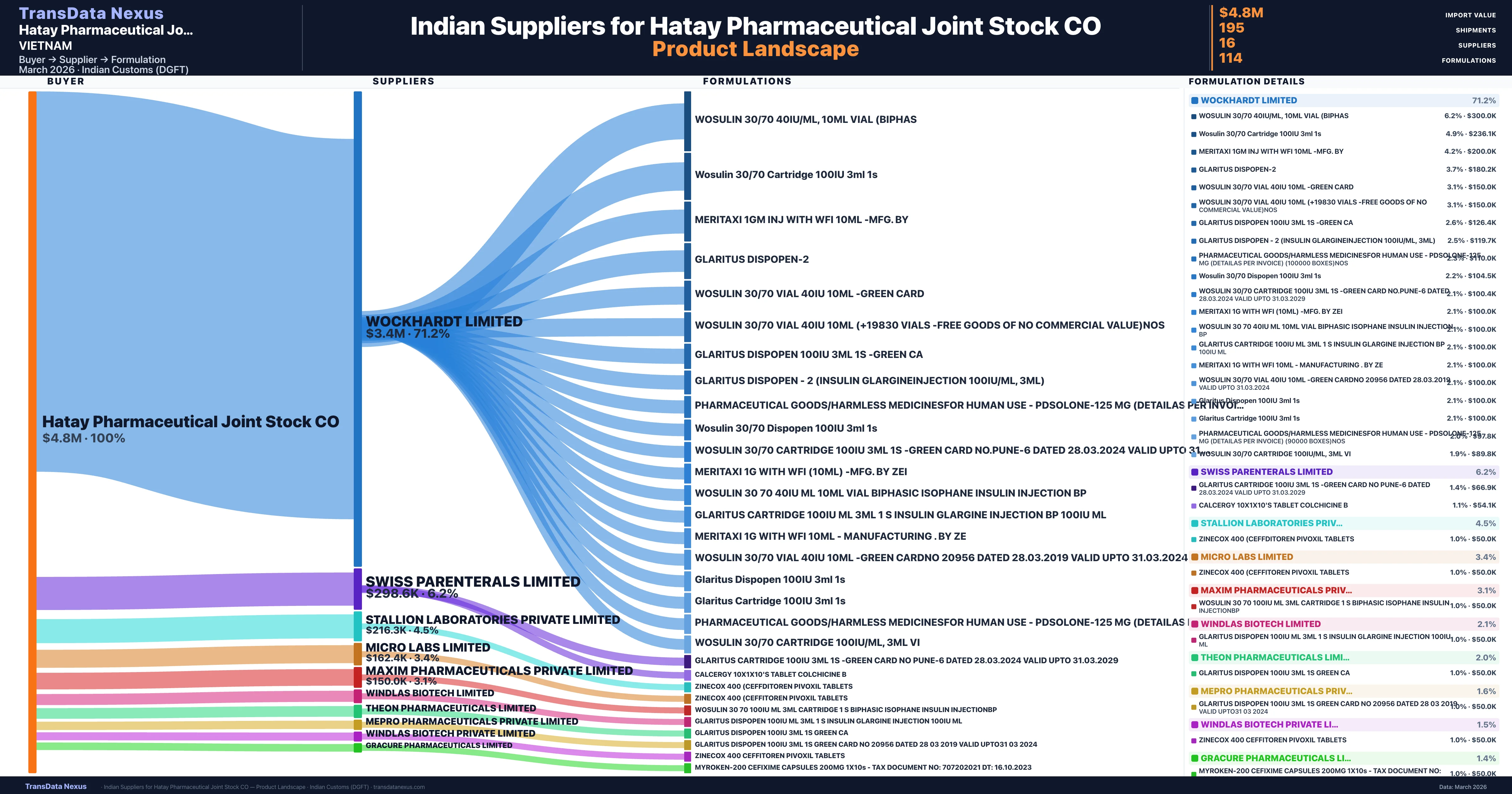 - 5.Supplier Verification: Hatay Pharmaceutical Joint Stock CO sources from 16 verified Indian suppliers across 114 formulations, confirmed from customs records.