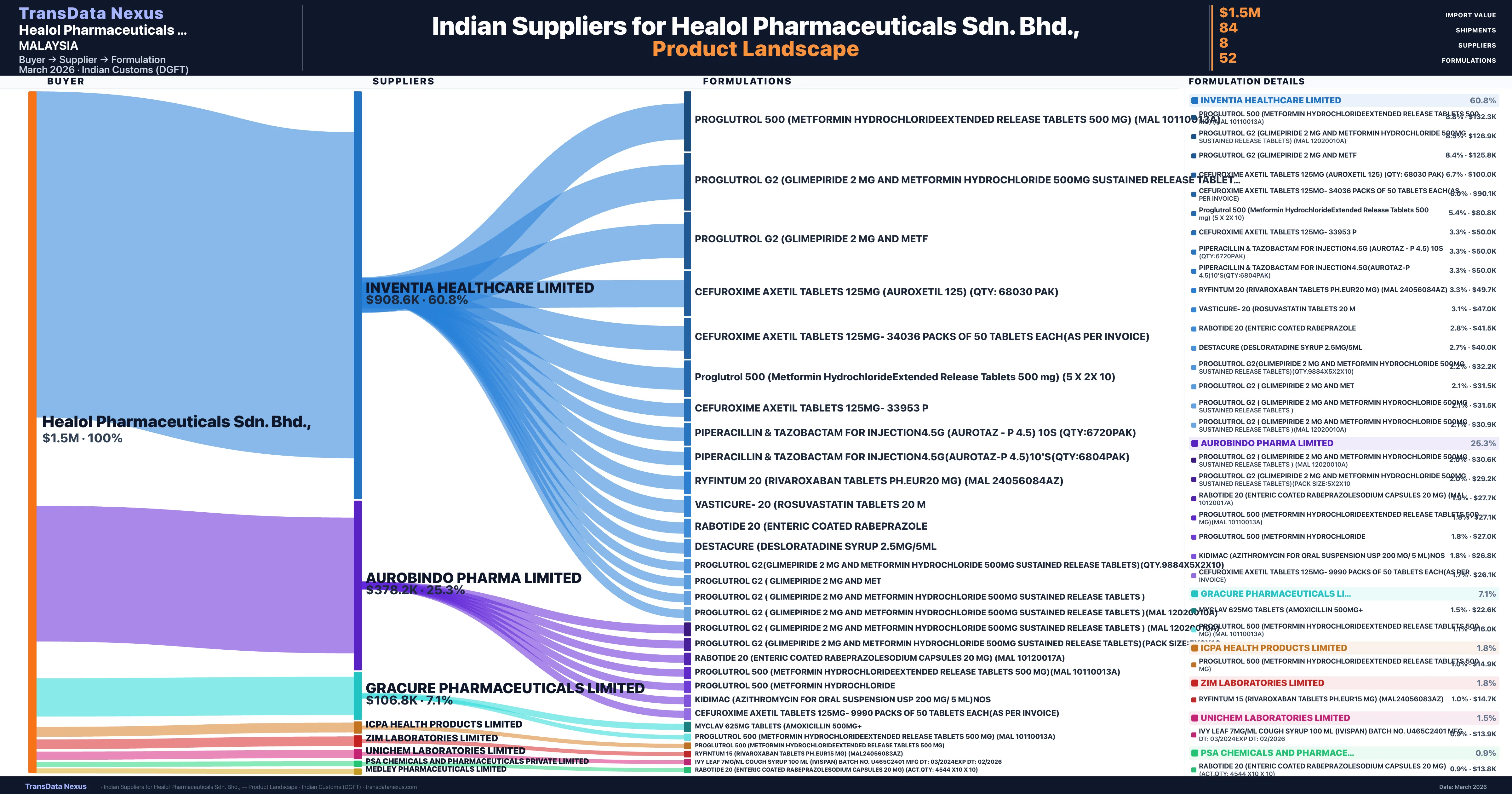 - 5.Supplier Verification: Healol Pharmaceuticals Sdn. Bhd., sources from 8 verified Indian suppliers across 52 formulations, confirmed from customs records.