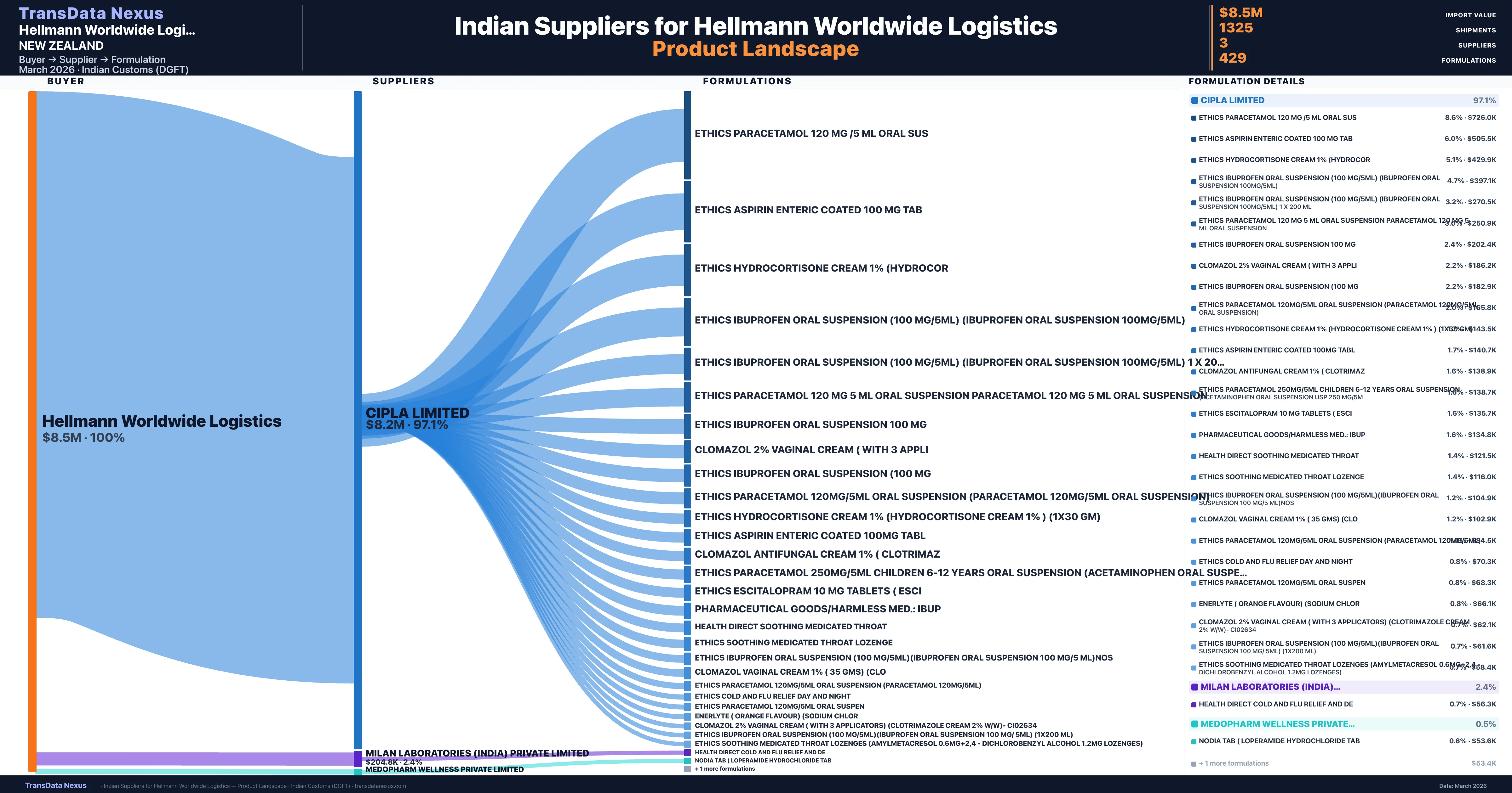 - 5.Supplier Verification: Hellmann Worldwide Logistics sources from 3 verified Indian suppliers across 429 formulations, confirmed from customs records.