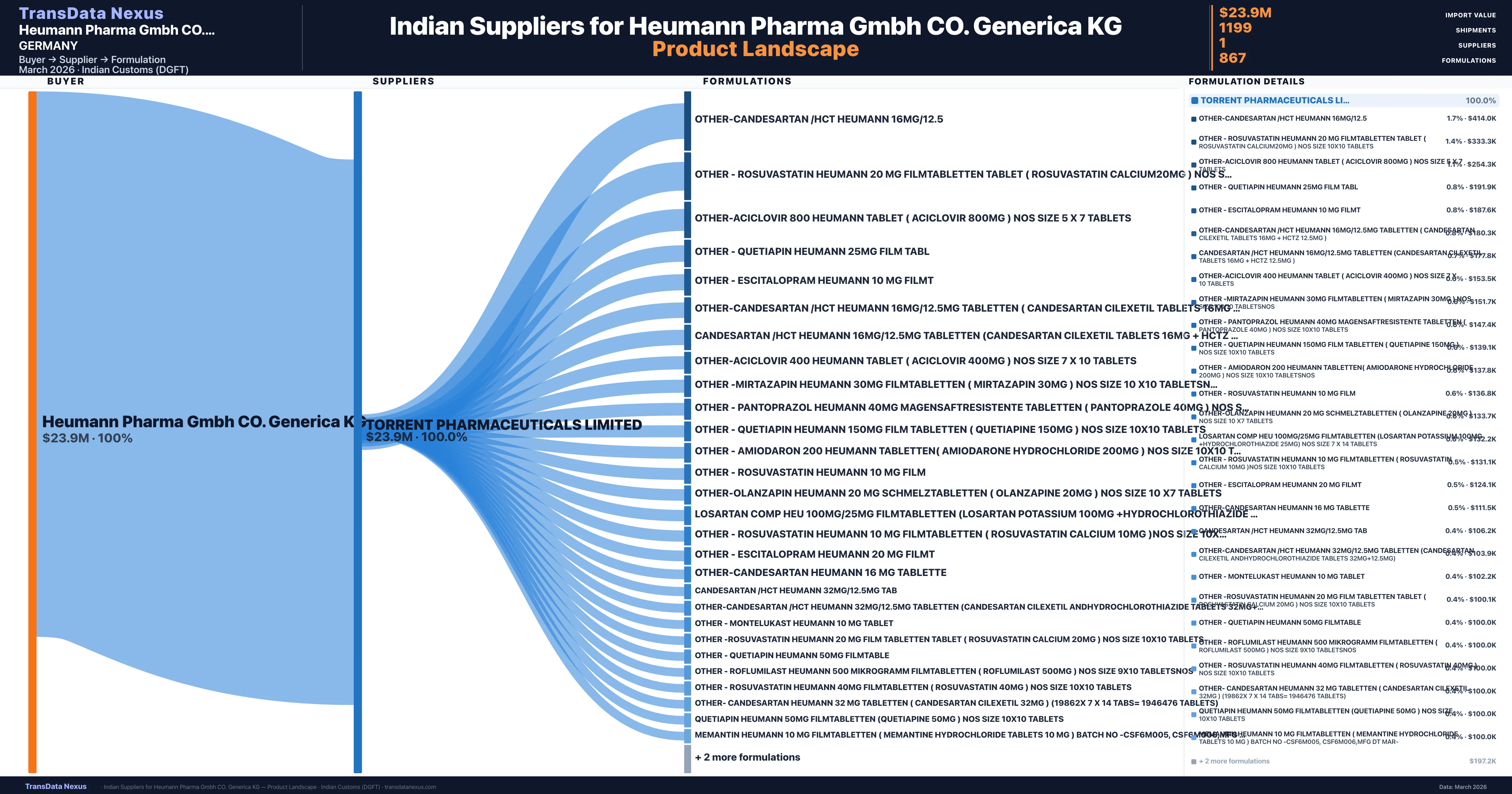 Heumann Pharma Gmbh CO. Generica KG sources from 1 verified Indian supplier across 867 distinct formulations. The sourcing is highly concentrated — Torrent Pharmaceuticals Limited accounts for 100.0% of total imports, indicating a strategic single-source relationship.