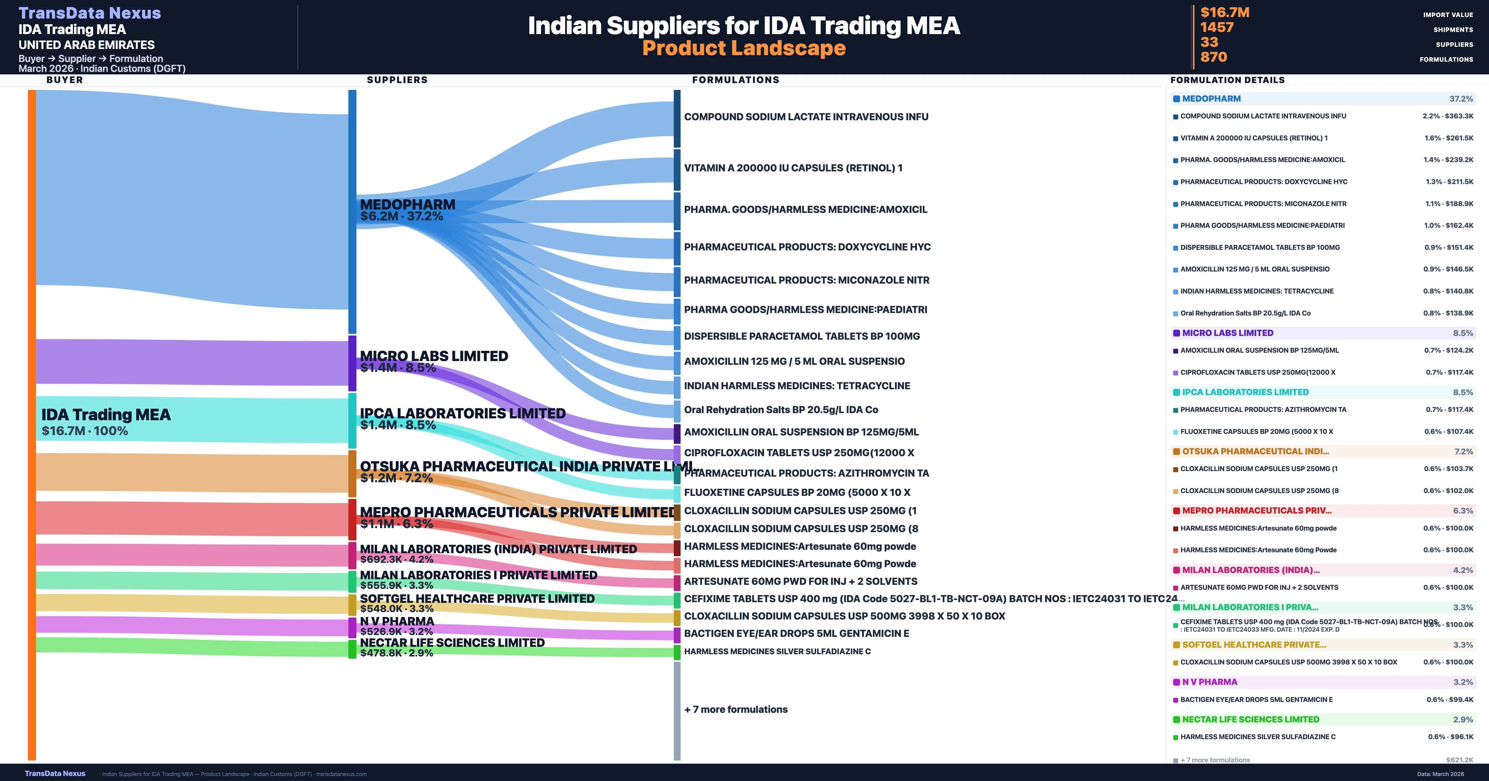 - 5.Supplier Verification: IDA Trading MEA sources from 33 verified Indian suppliers across 870 formulations, confirmed from customs records.