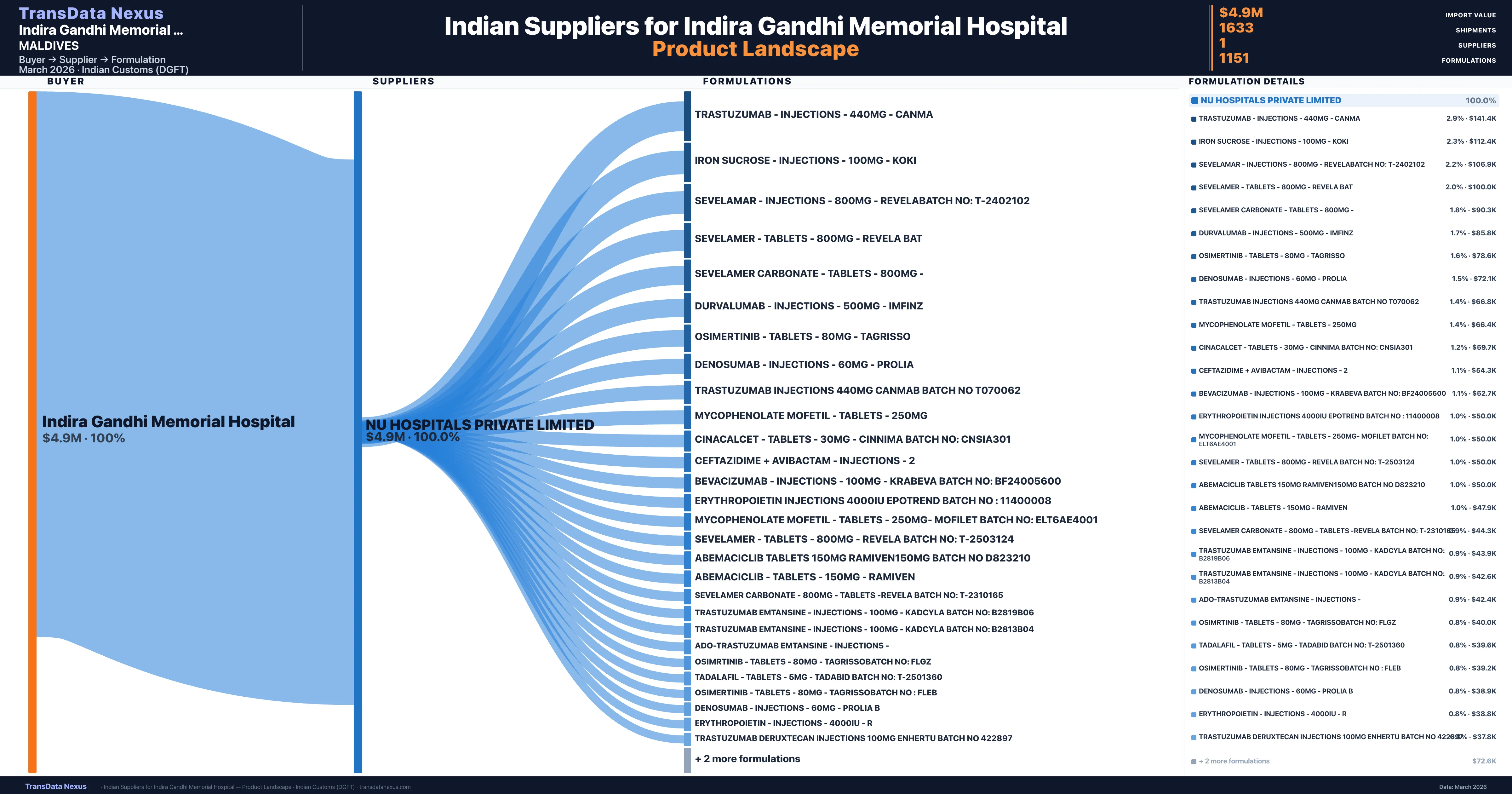 Indira Gandhi Memorial Hospital sources from 1 verified Indian supplier across 1,151 distinct formulations. The sourcing is highly concentrated — Nu Hospitals Private Limited accounts for 100.0% of total imports, indicating a strategic single-source relationship.