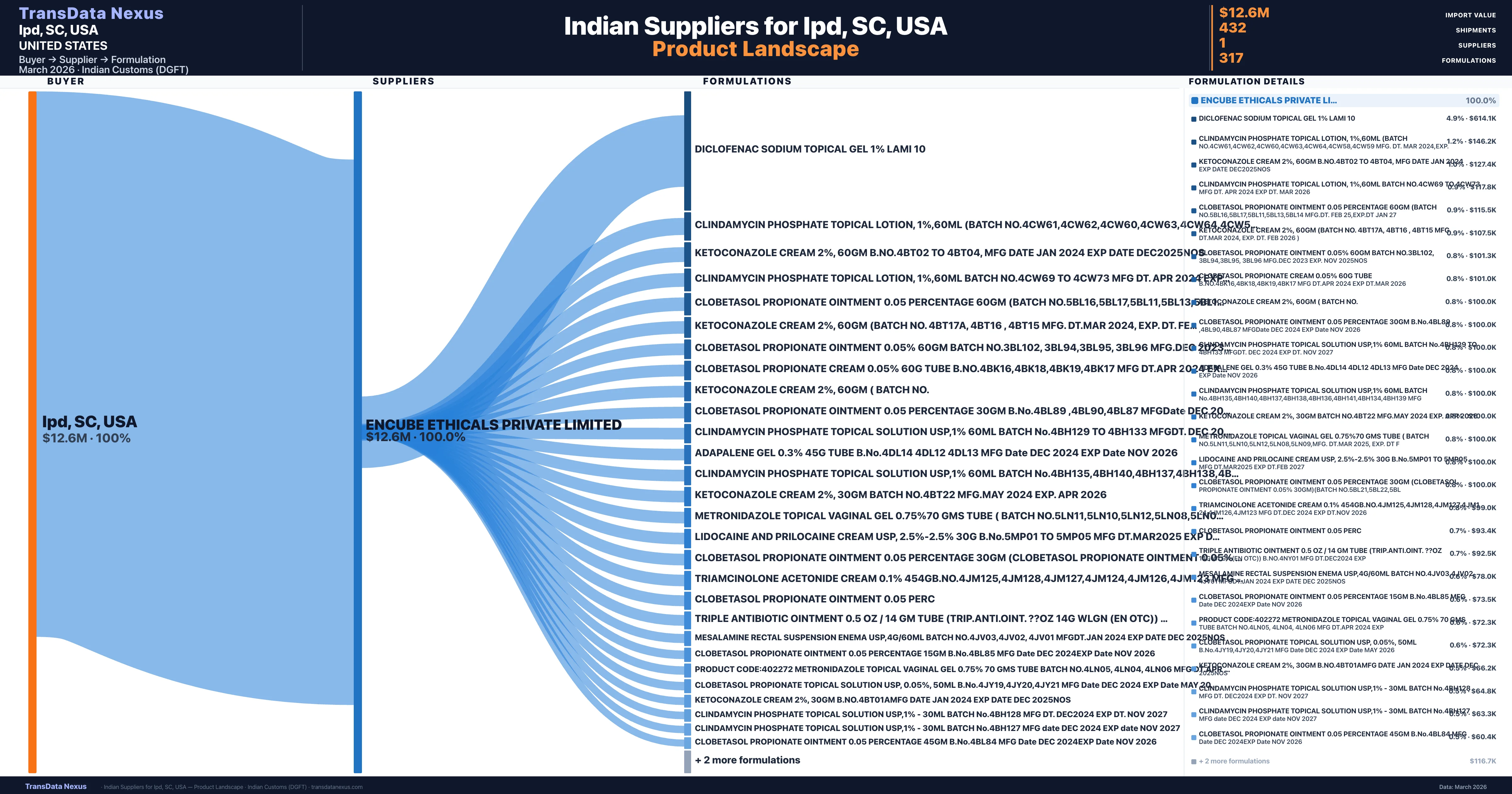 Ipd, SC, USA sources from 1 verified Indian supplier across 317 distinct formulations. The sourcing is highly concentrated β Encube Ethicals Private Limited accounts for 100.0% of total imports, indicating a strategic single-source relationship.