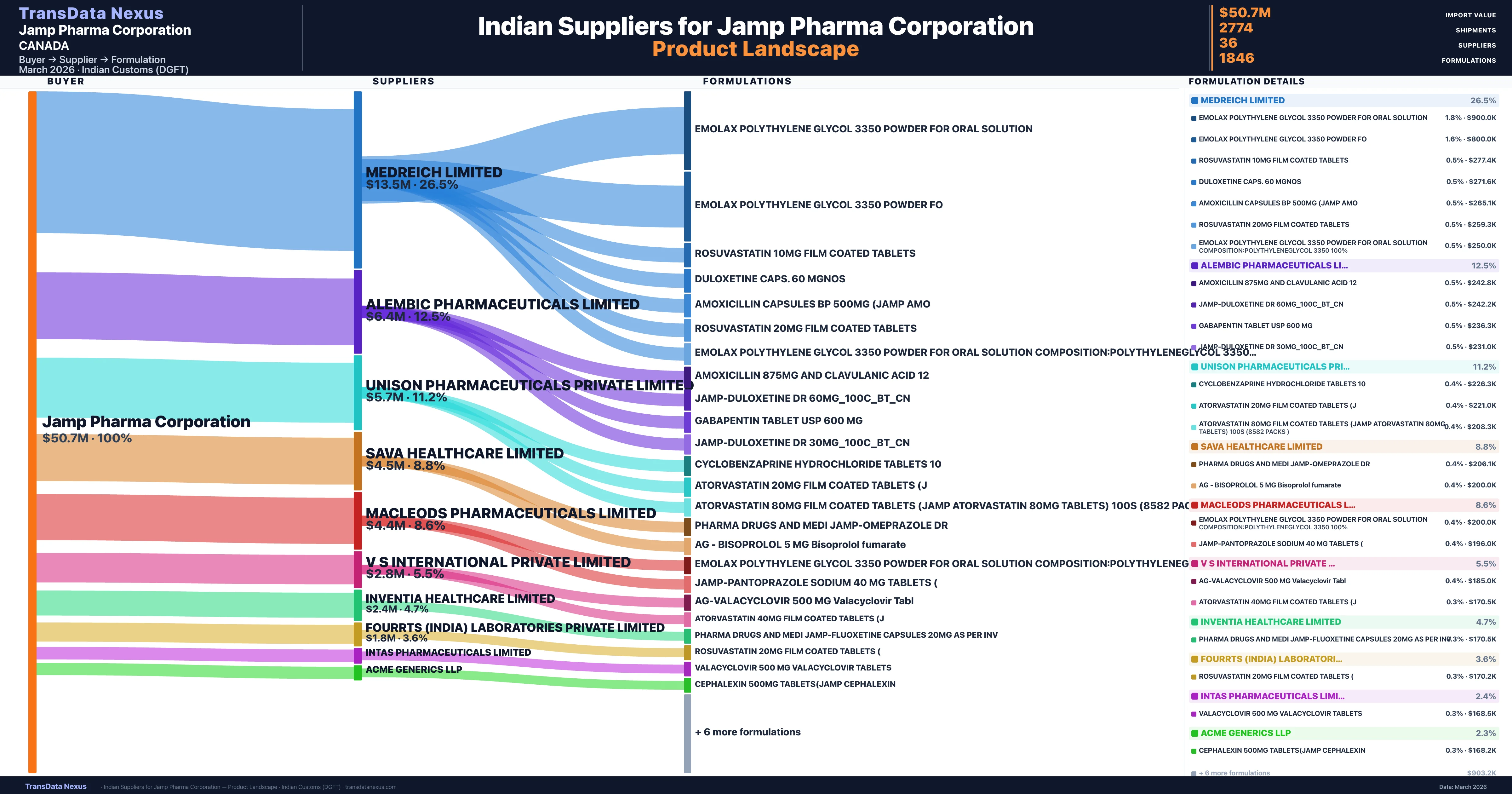 Jamp Pharma Corporation sources from 36 verified Indian suppliers. The primary supplier is Medreich Limited (26.5% of imports, $13.5M).