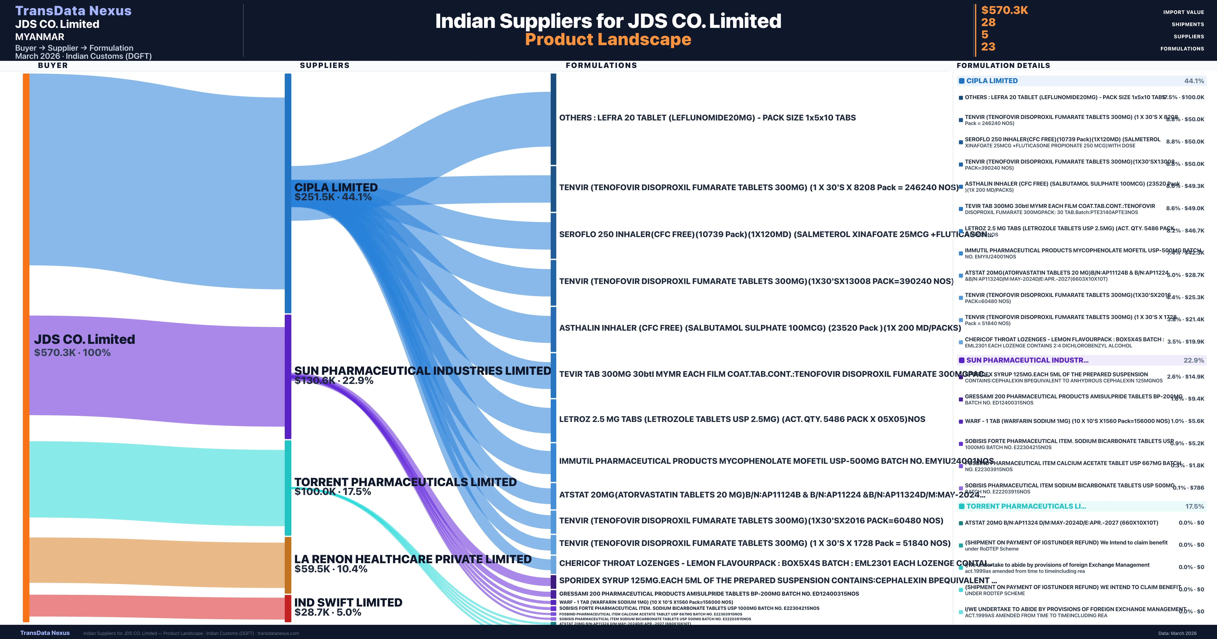 JDS CO. Limited is a pharmaceutical importer based in Myanmar with a total trade value of $757.7K across 3 products in 3 therapeutic categories. Based on 18 verified import shipments from Indian Customs (DGFT) records, the company actively imports across multiple product segments. JDS CO. Limited sources from 5 verified Indian suppliers, with Cipla Limited accounting for 44.1% of imports.