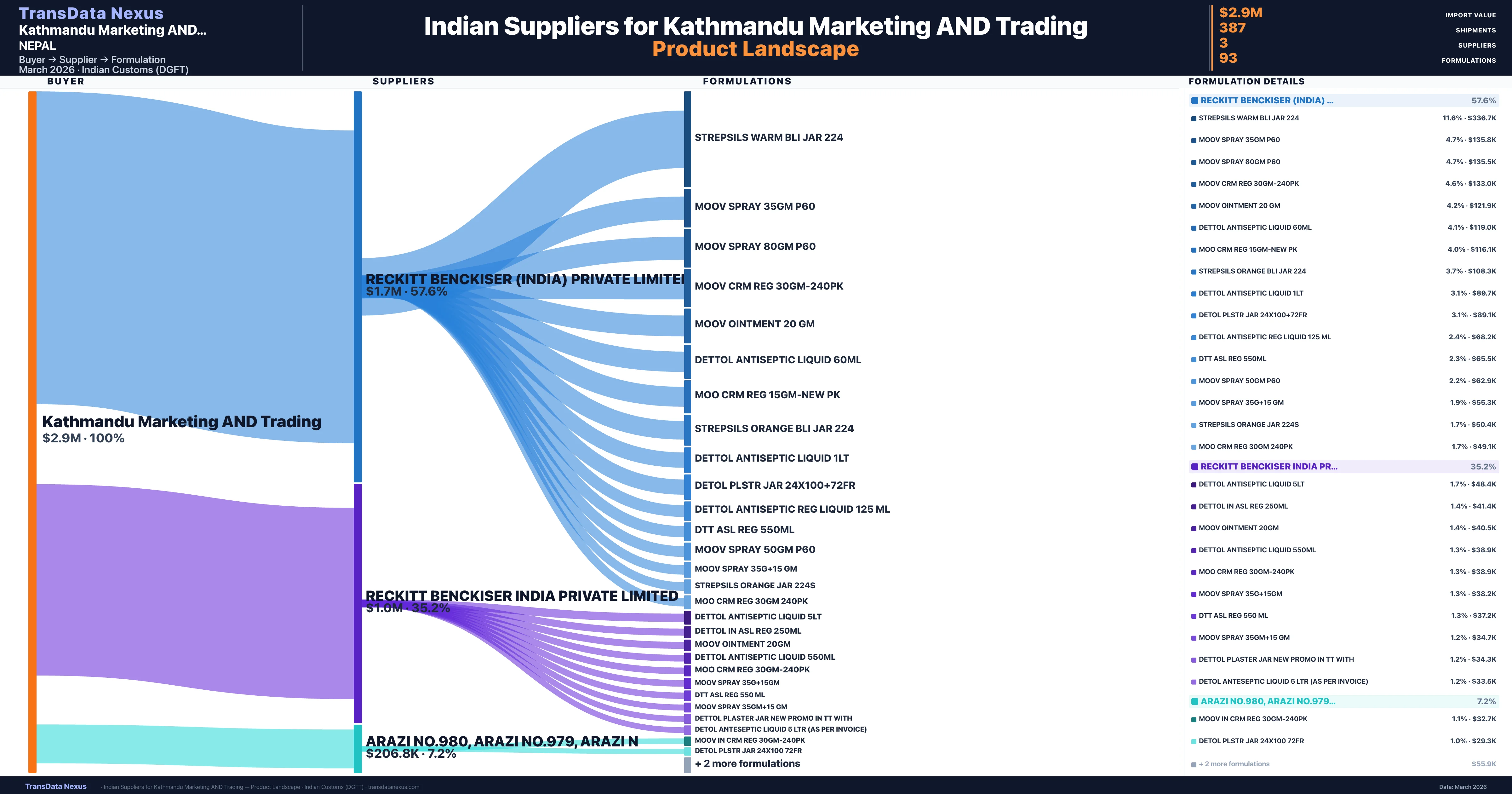Kathmandu Marketing AND Trading sources from 3 verified Indian suppliers. The primary supplier is Reckitt Benckiser (india) Private Limited (57.6% of imports, $1.7M).