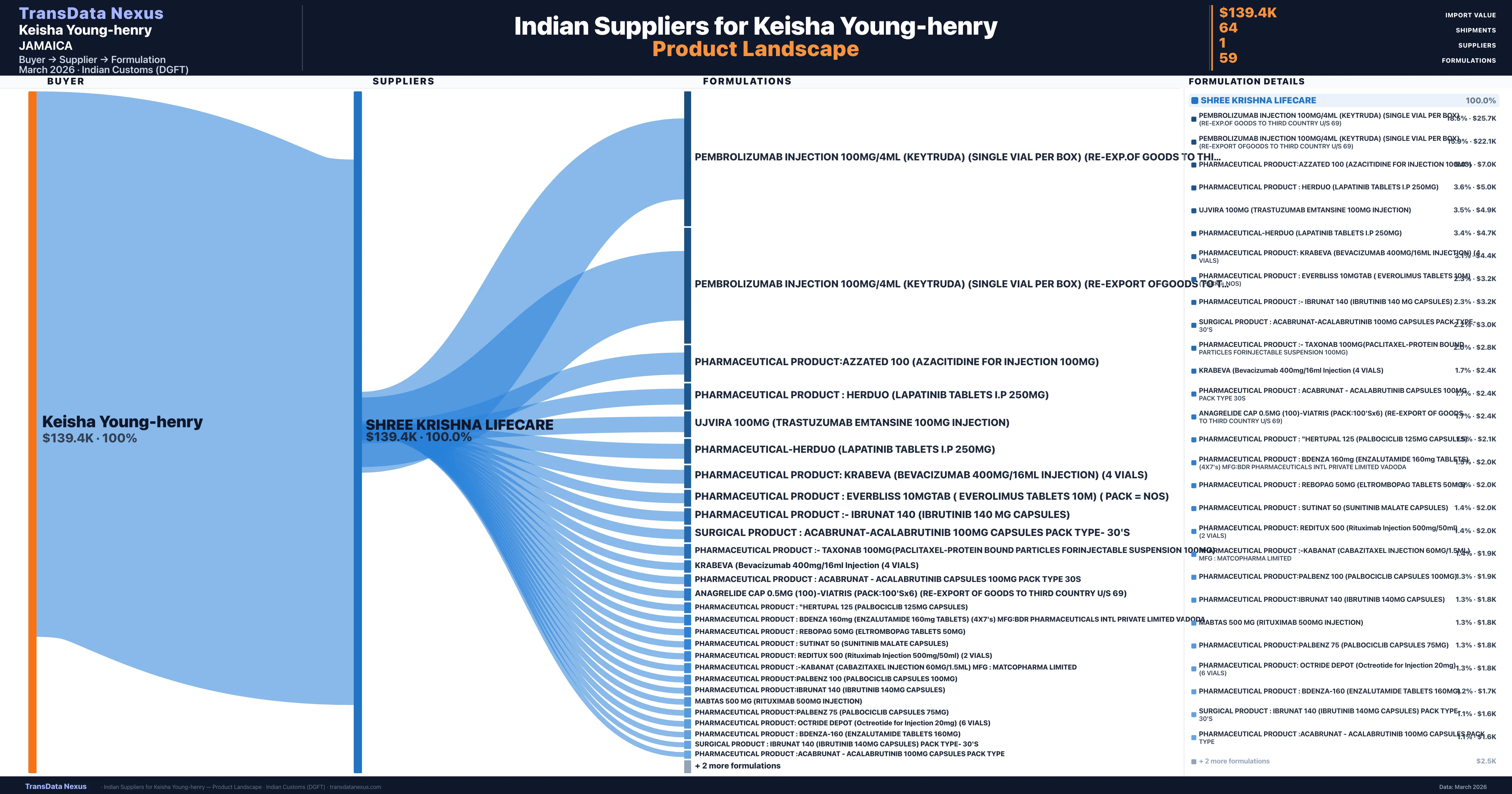 Keisha Young-henry sources from 1 verified Indian supplier across 59 distinct formulations. The sourcing is highly concentrated β Shree Krishna Lifecare accounts for 100.0% of total imports, indicating a strategic single-source relationship.