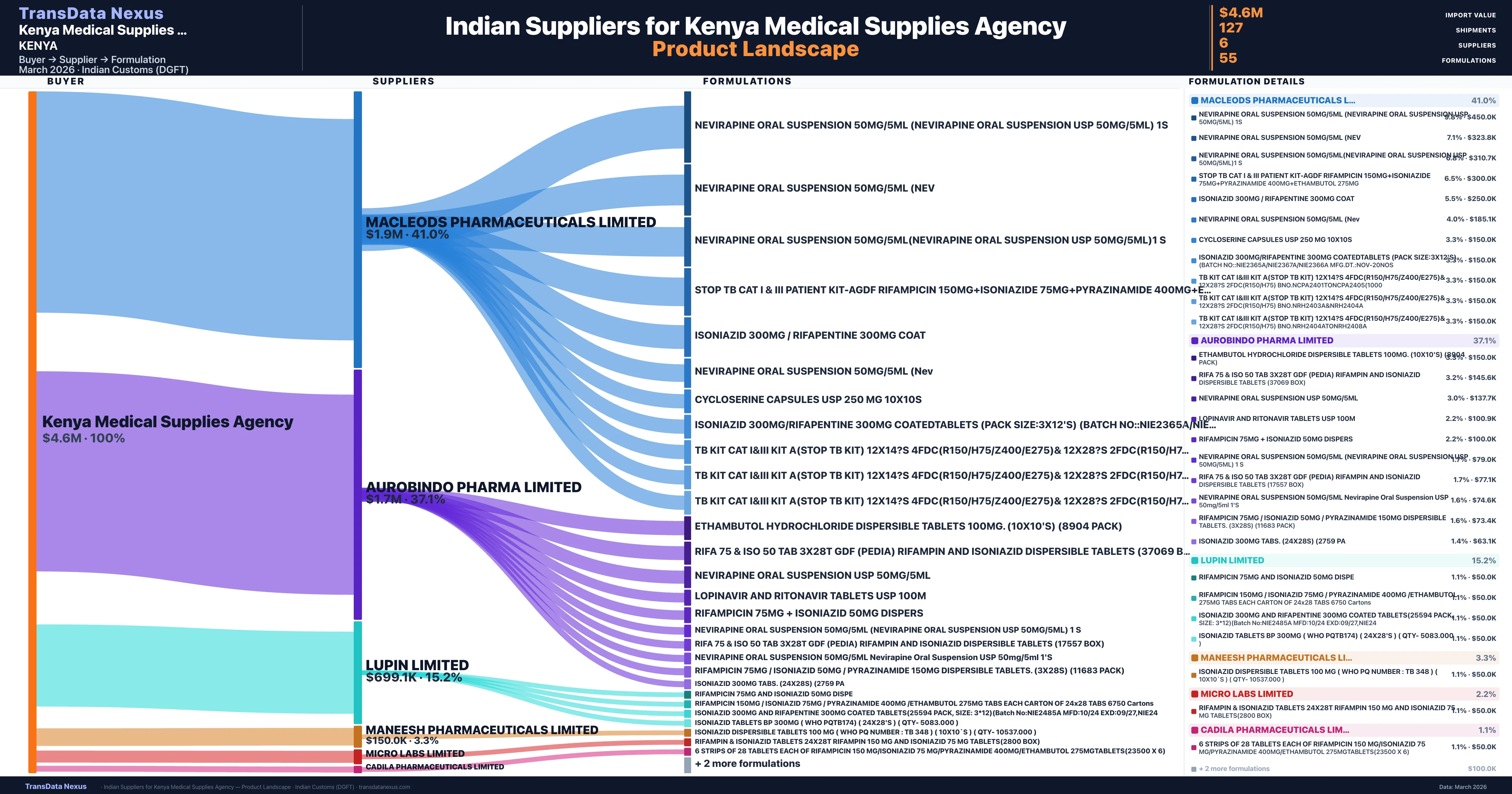 - 5.Supplier Verification: Kenya Medical Supplies Agency sources from 6 verified Indian suppliers across 55 formulations, confirmed from customs records.