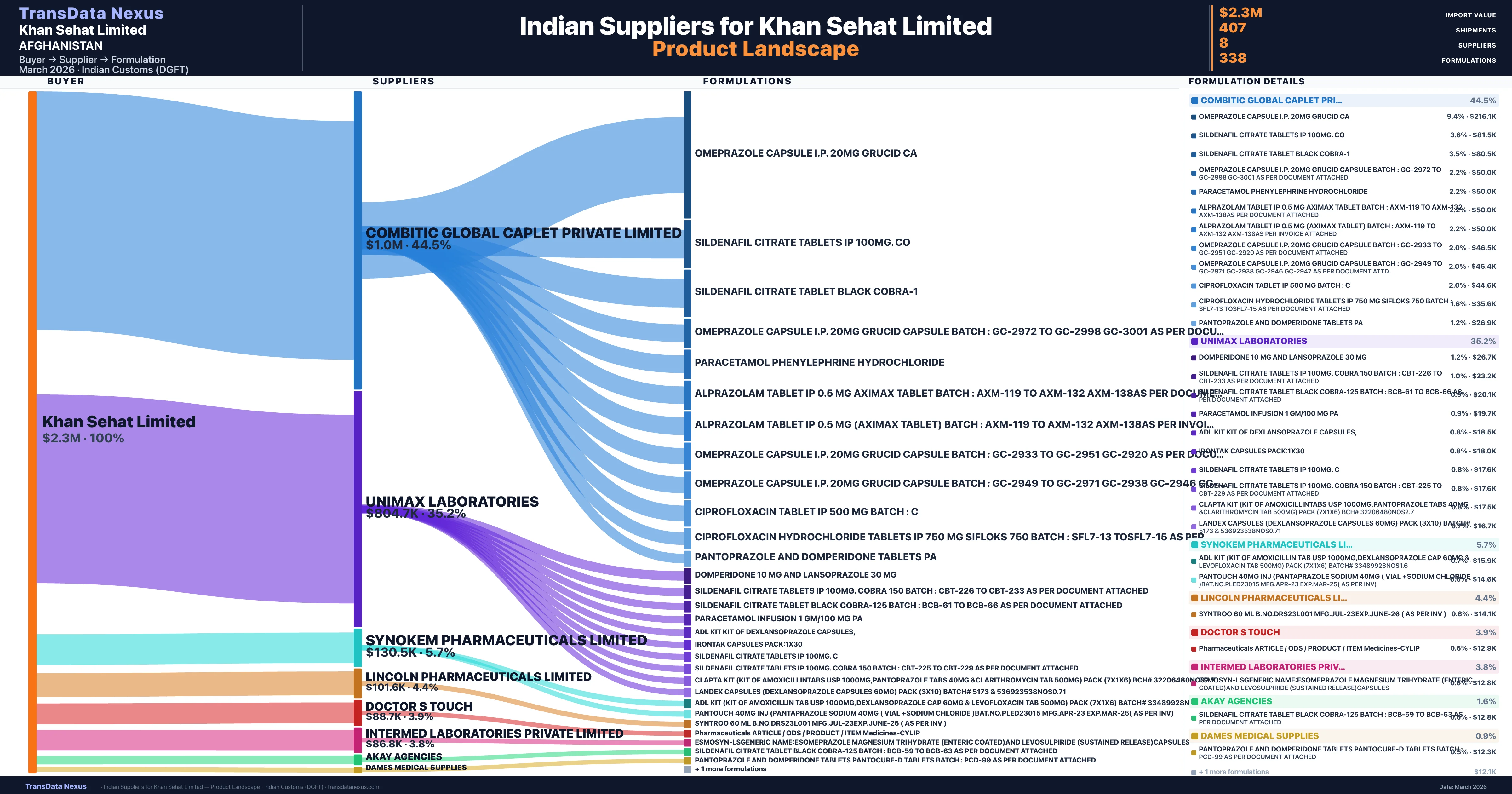 Khan Sehat Limited is a pharmaceutical importer based in Afghanistan with a total trade value of $1.8M across 5 products in 3 therapeutic categories. Based on 36 verified import shipments from Indian Customs (DGFT) records, Khan Sehat Limited is the #1 buyer in 1 product including Amikacin. Khan Sehat Limited sources from 8 verified Indian suppliers, with Combitic Global Caplet Private Limited accounting for 44.5% of imports.