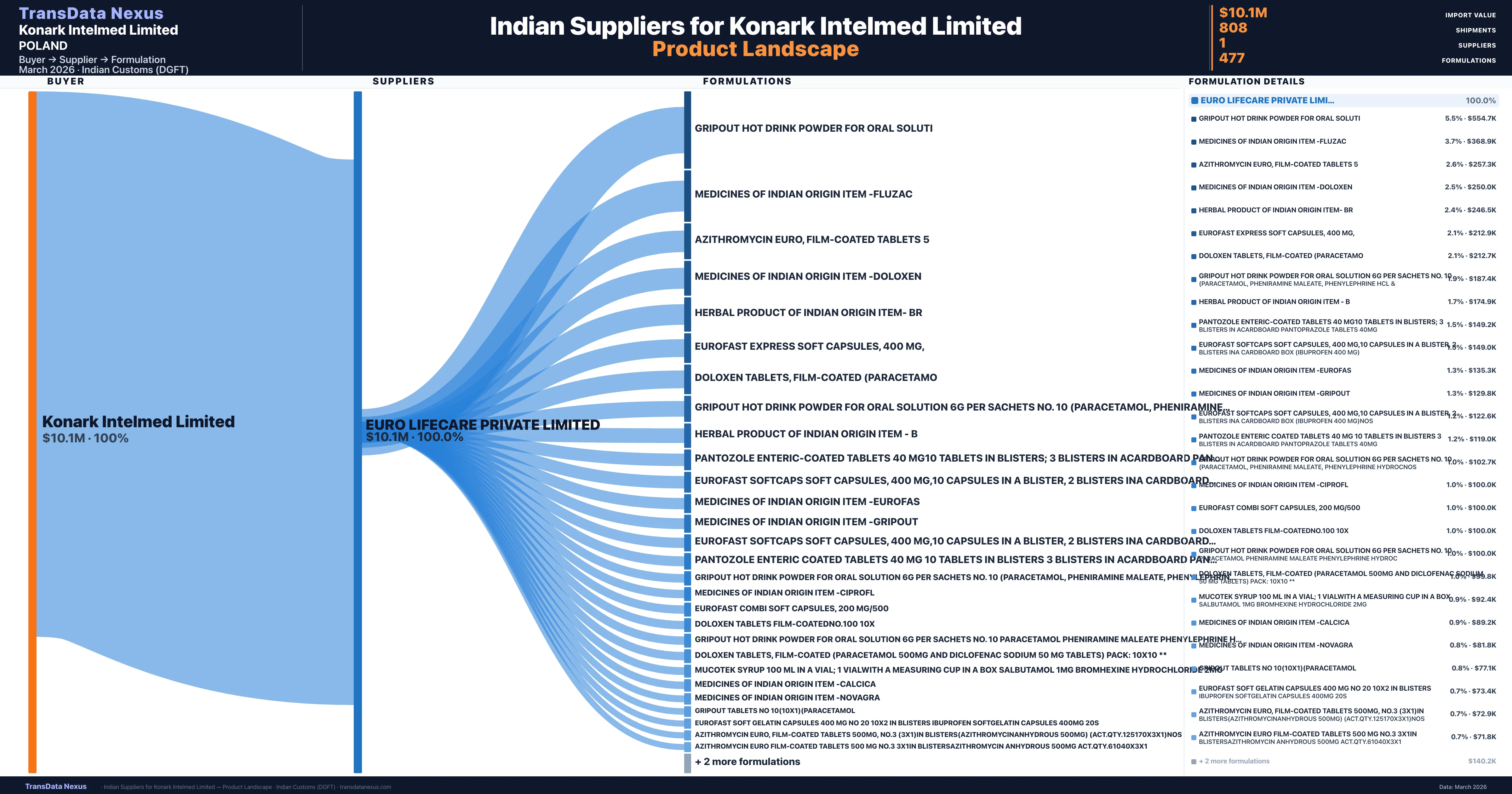 Konark Intelmed Limited sources from 1 verified Indian supplier across 477 distinct formulations. The sourcing is highly concentrated — Euro Lifecare Private Limited accounts for 100.0% of total imports, indicating a strategic single-source relationship.