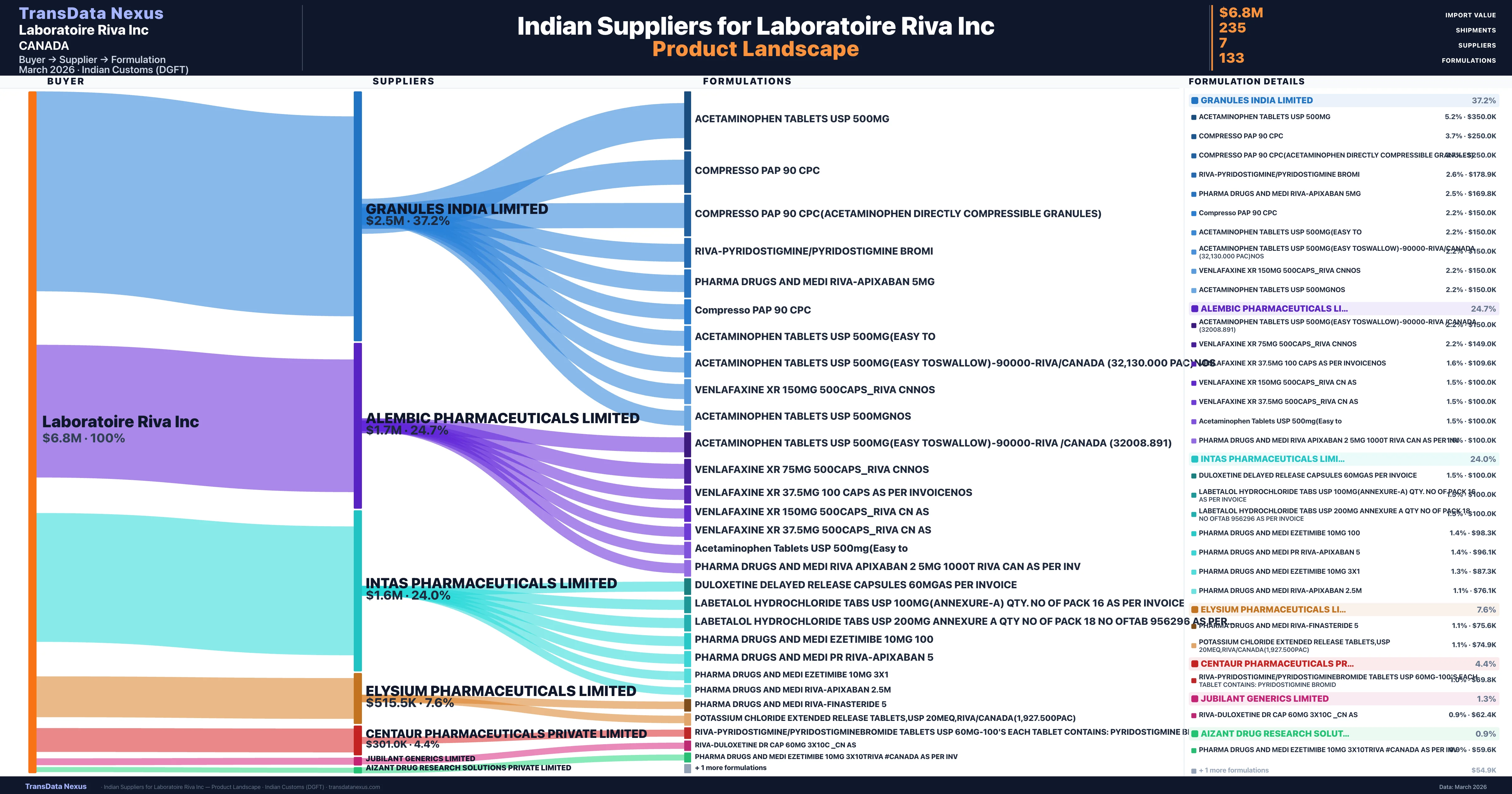 Laboratoire Riva Inc sources from 7 verified Indian suppliers. The primary supplier is Granules India Limited (37.2% of imports, $2.5M).
