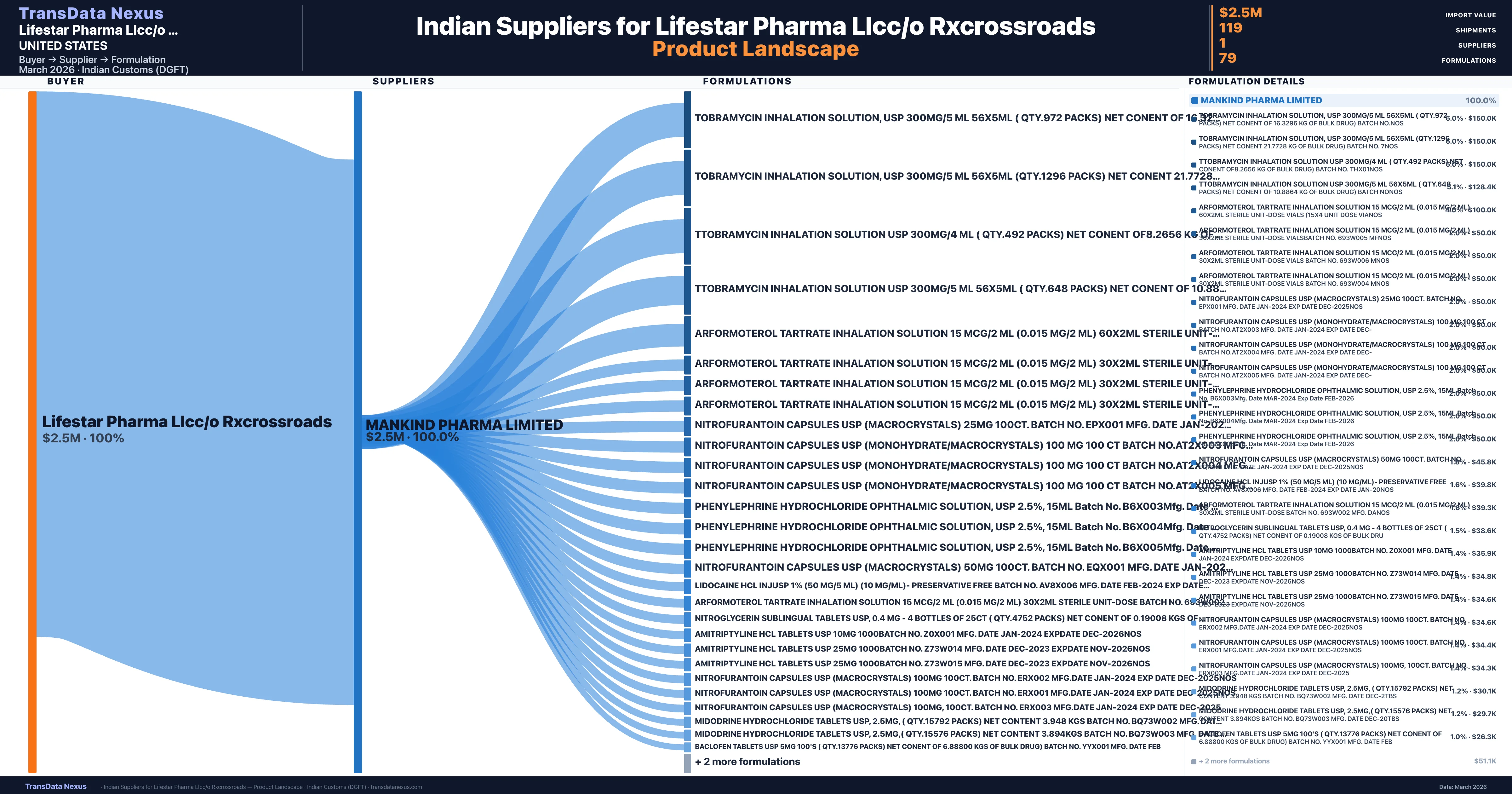 Lifestar Pharma Llcc/o Rxcrossroads sources from 1 verified Indian supplier across 79 distinct formulations. The sourcing is highly concentrated — Mankind Pharma Limited accounts for 100.0% of total imports, indicating a strategic single-source relationship.