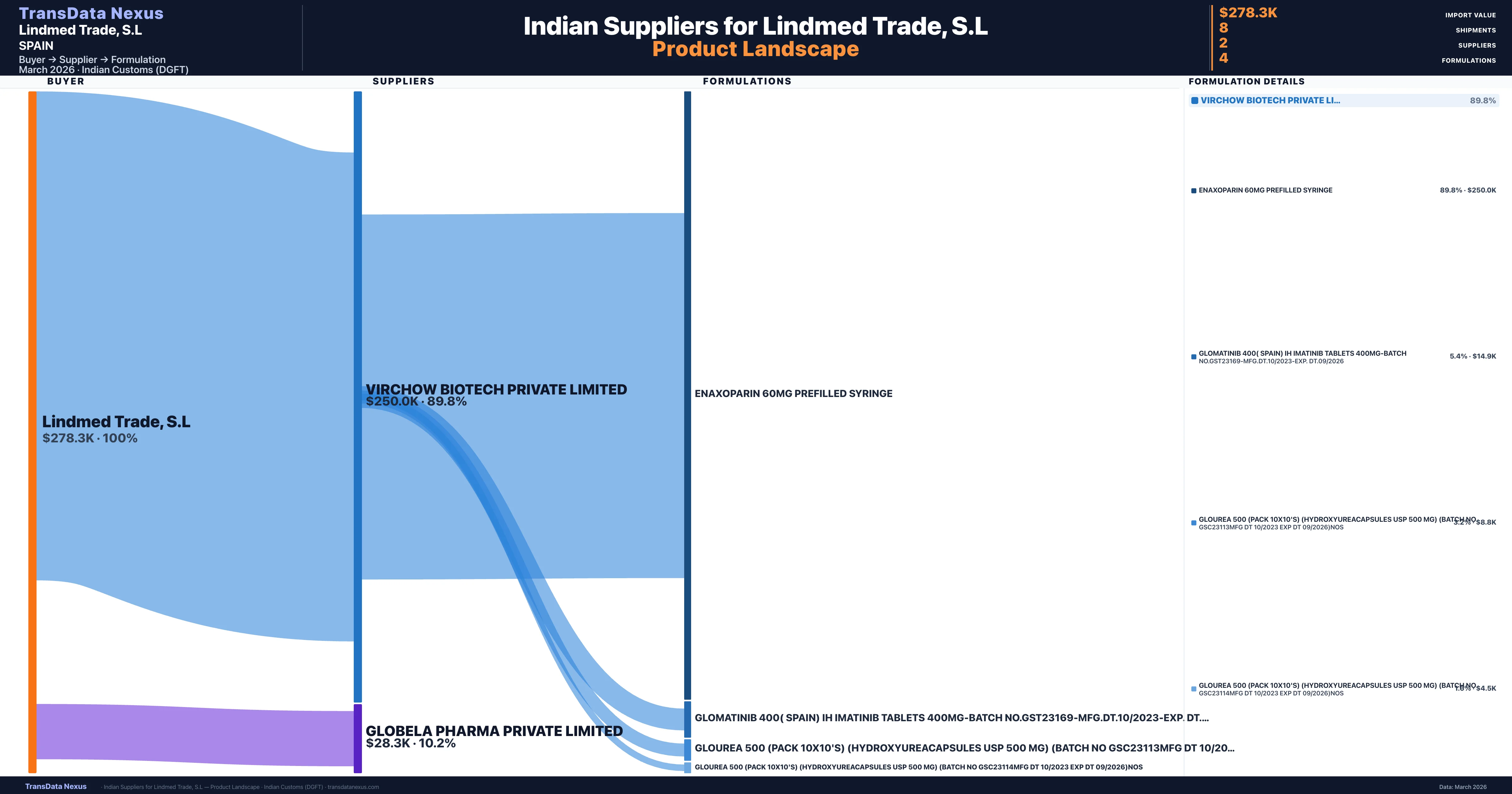 Lindmed Trade, S.L is a pharmaceutical importer based in Spain with a total trade value of $400.0K across 2 products in 2 therapeutic categories. Based on 8 verified import shipments from Indian Customs (DGFT) records, the company actively imports across multiple product segments. Lindmed Trade, S.L sources from 2 verified Indian suppliers, with Virchow Biotech Private Limited accounting for 89.8% of imports.
