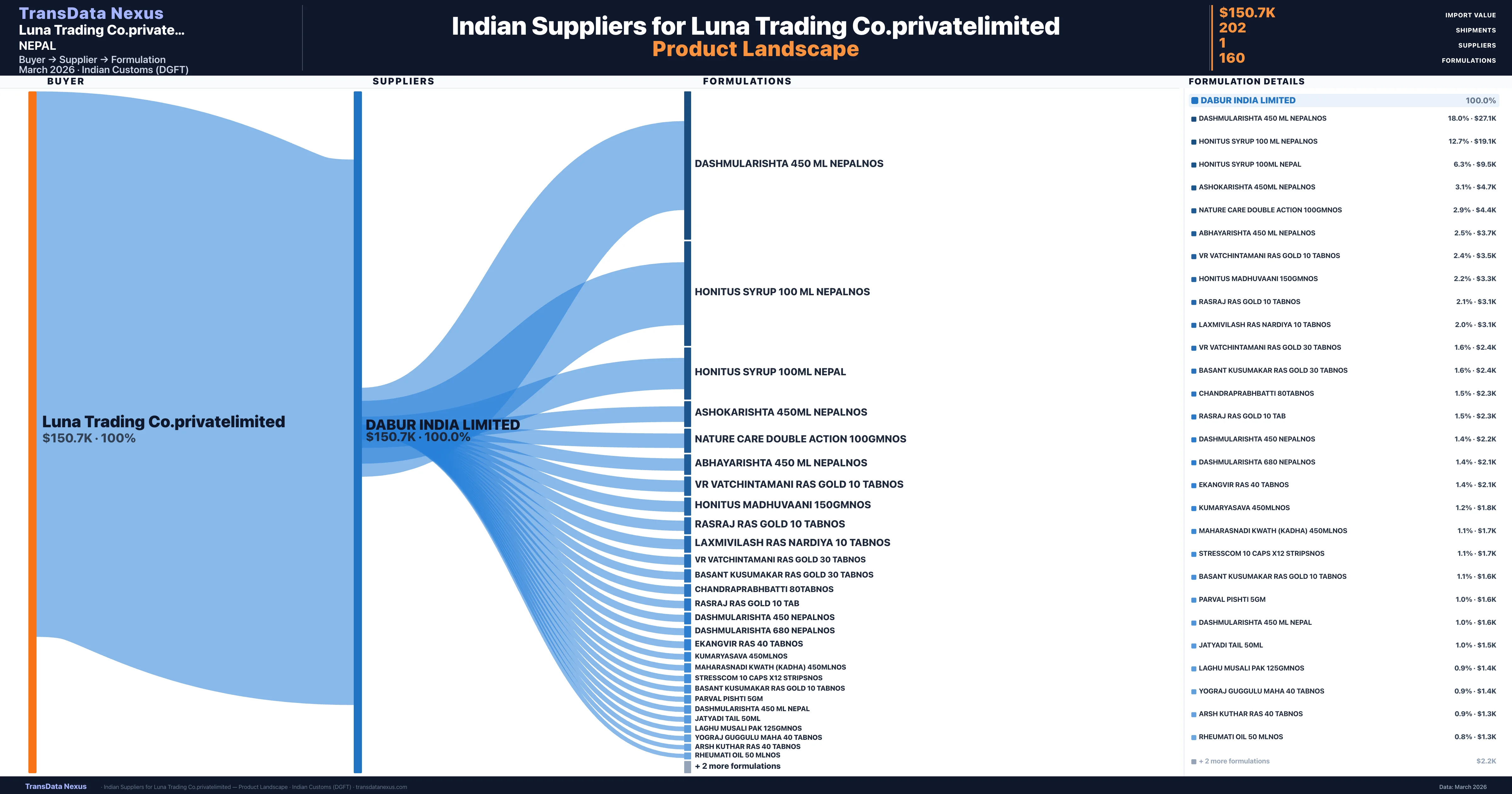Luna Trading Co.privatelimited sources from 1 verified Indian supplier across 160 distinct formulations. The sourcing is highly concentrated β Dabur India Limited accounts for 100.0% of total imports, indicating a strategic single-source relationship.