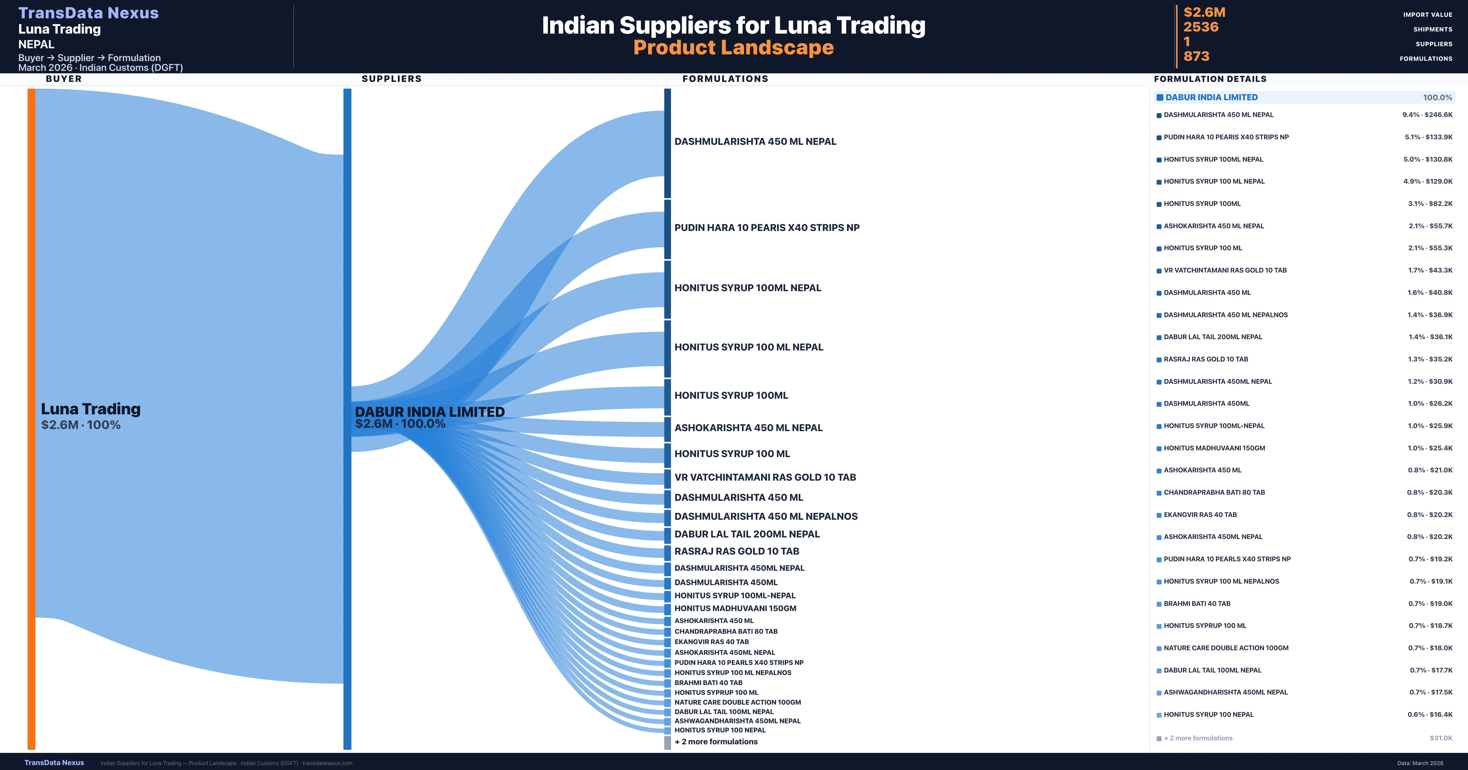 Luna Trading sources from 1 verified Indian supplier across 873 distinct formulations. The sourcing is highly concentrated — Dabur India Limited accounts for 100.0% of total imports, indicating a strategic single-source relationship.