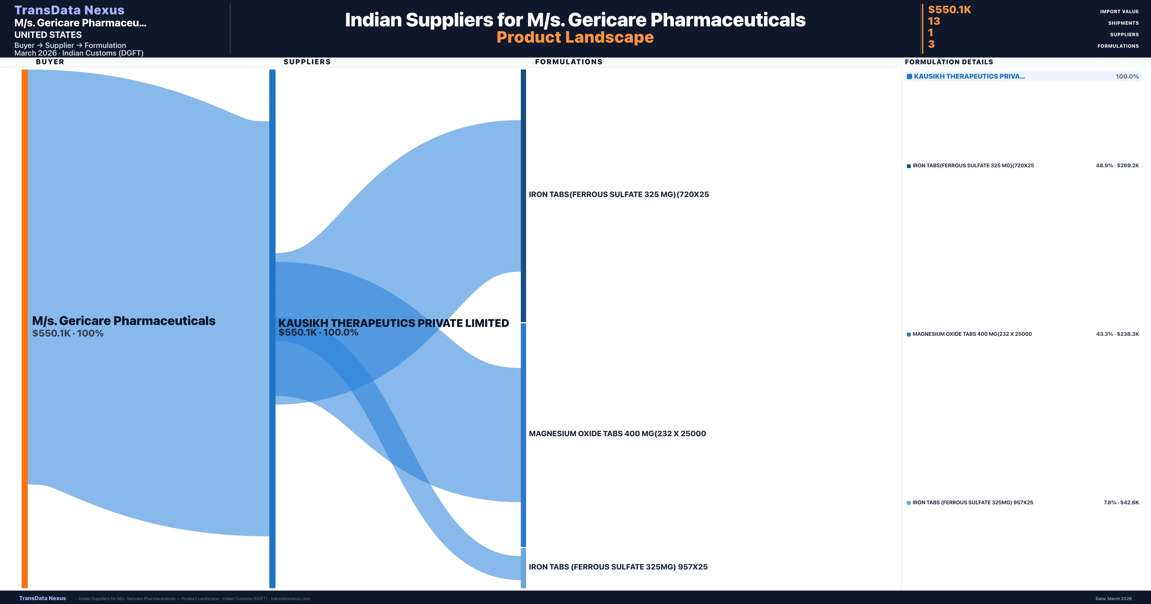 M/s. Gericare Pharmaceuticals sources from 1 verified Indian supplier across 3 distinct formulations. The sourcing is highly concentrated β Kausikh Therapeutics Private Limited accounts for 100.0% of total imports, indicating a strategic single-source relationship.