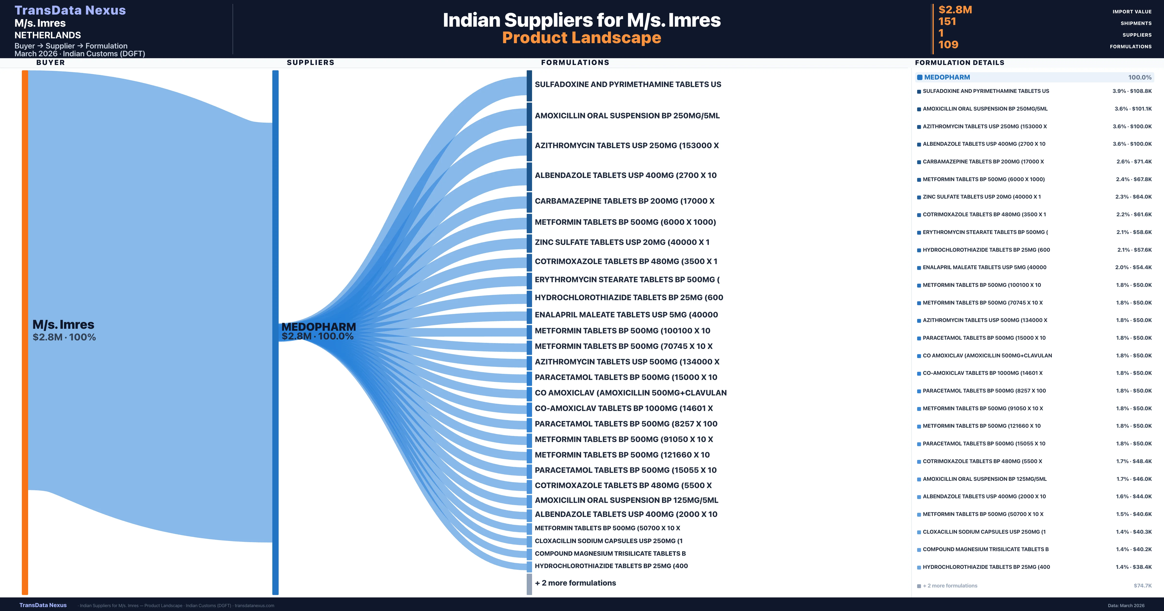 M/s. Imres sources from 1 verified Indian supplier across 109 distinct formulations. The sourcing is highly concentrated β Medopharm accounts for 100.0% of total imports, indicating a strategic single-source relationship.