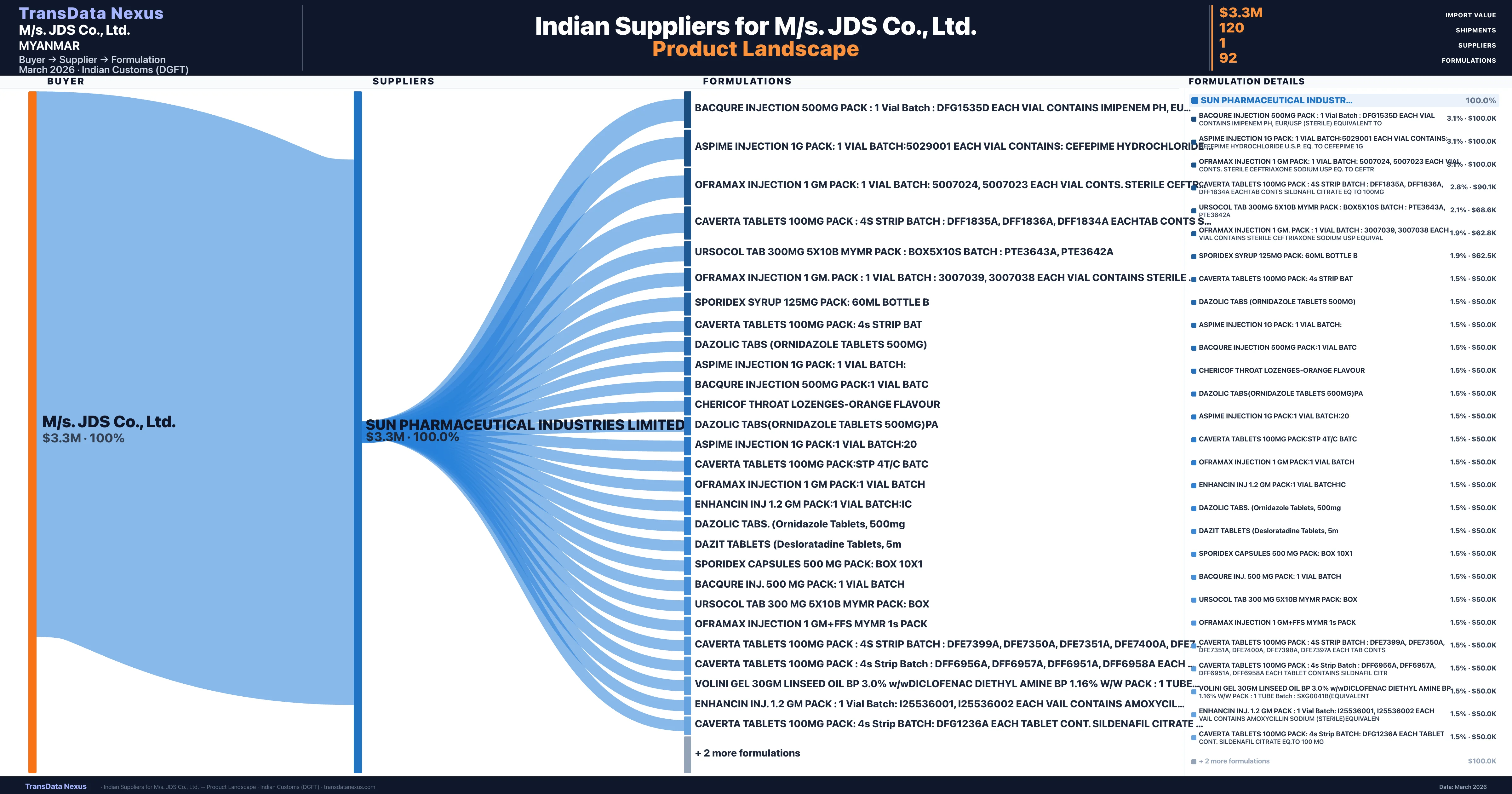 M/s. JDS Co., Ltd. sources from 1 verified Indian supplier across 92 distinct formulations. The sourcing is highly concentrated — Sun Pharmaceutical Industries Limited accounts for 100.0% of total imports, indicating a strategic single-source relationship.
