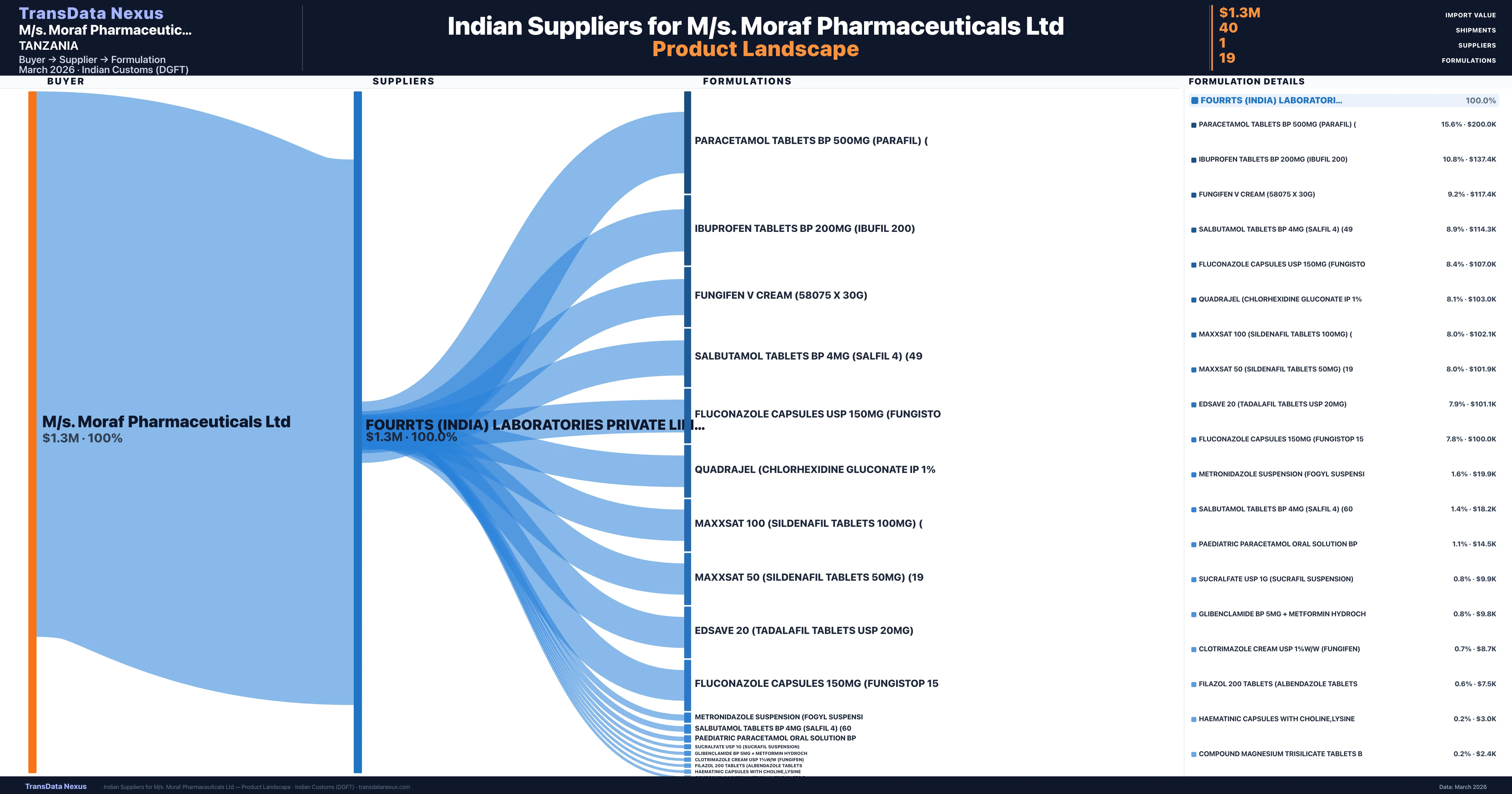 M/s. Moraf Pharmaceuticals Ltd sources from 1 verified Indian suppliers. The primary supplier is Fourrts (india) Laboratories Private Limited (100.0% of imports, $1.3M).