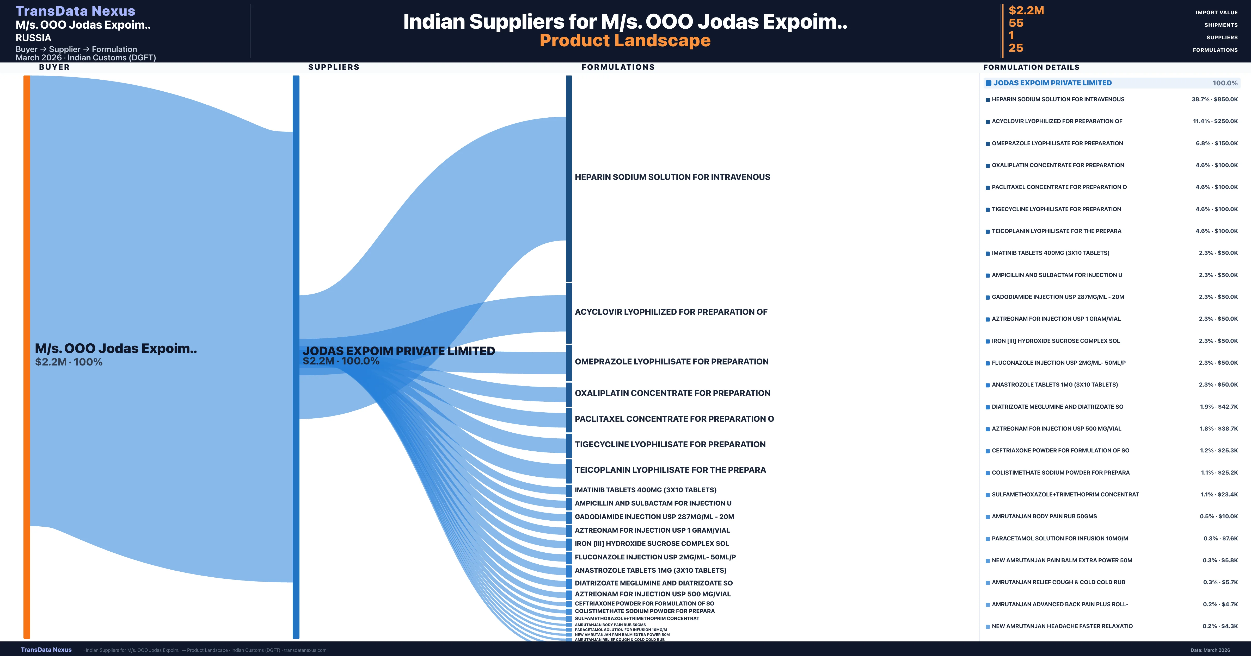 M/s. OOO Jodas Expoim.. sources from 1 verified Indian supplier across 25 distinct formulations. The sourcing is highly concentrated — Jodas Expoim Private Limited accounts for 100.0% of total imports, indicating a strategic single-source relationship.