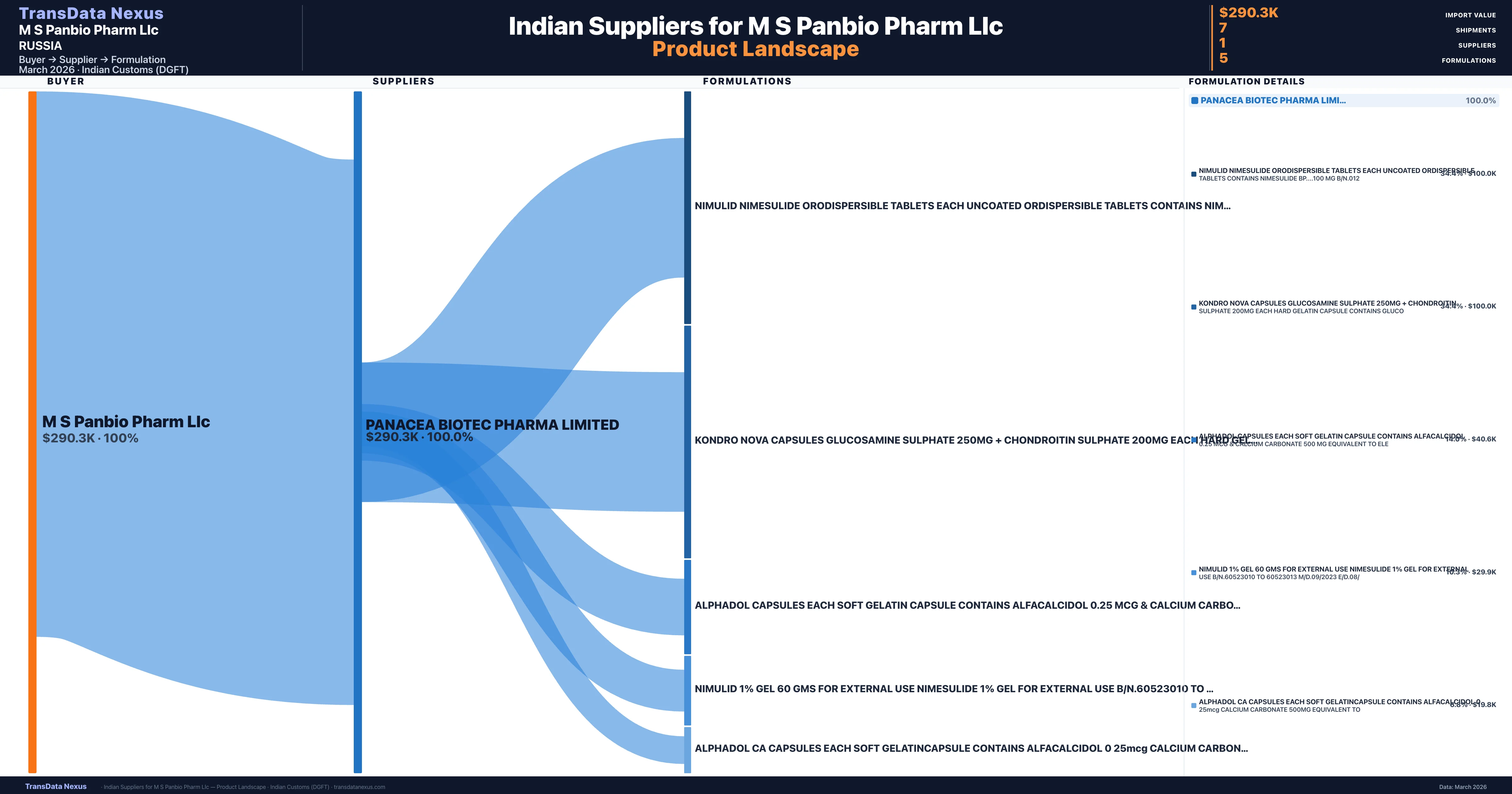 M S Panbio Pharm Llc sources from 1 verified Indian supplier across 5 distinct formulations. The sourcing is highly concentrated — Panacea Biotec Pharma Limited accounts for 100.0% of total imports, indicating a strategic single-source relationship.