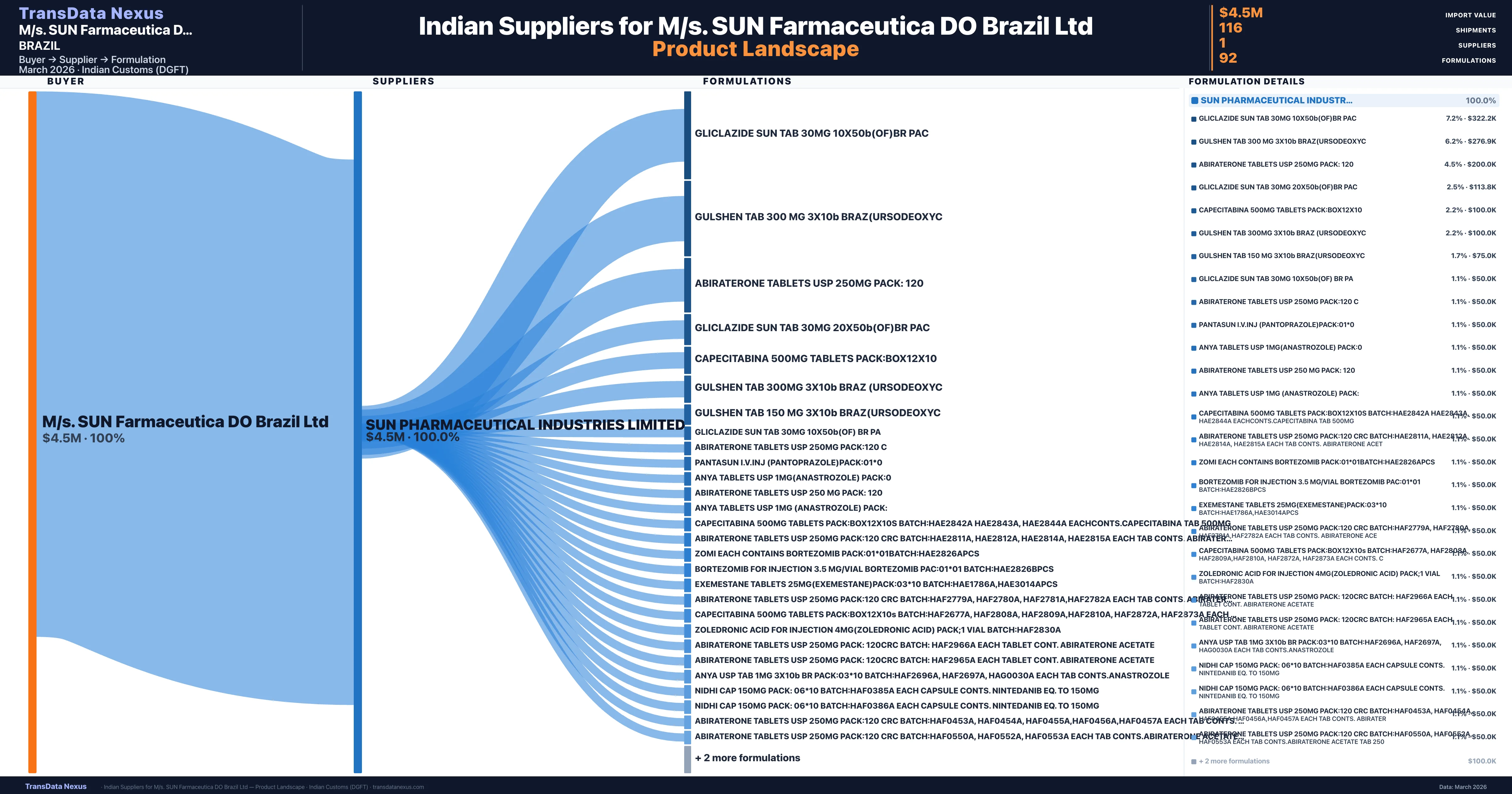 - 5.Supplier Verification: M/s. SUN Farmaceutica DO Brazil Ltd sources from 1 verified Indian suppliers across 92 formulations, confirmed from customs records.
