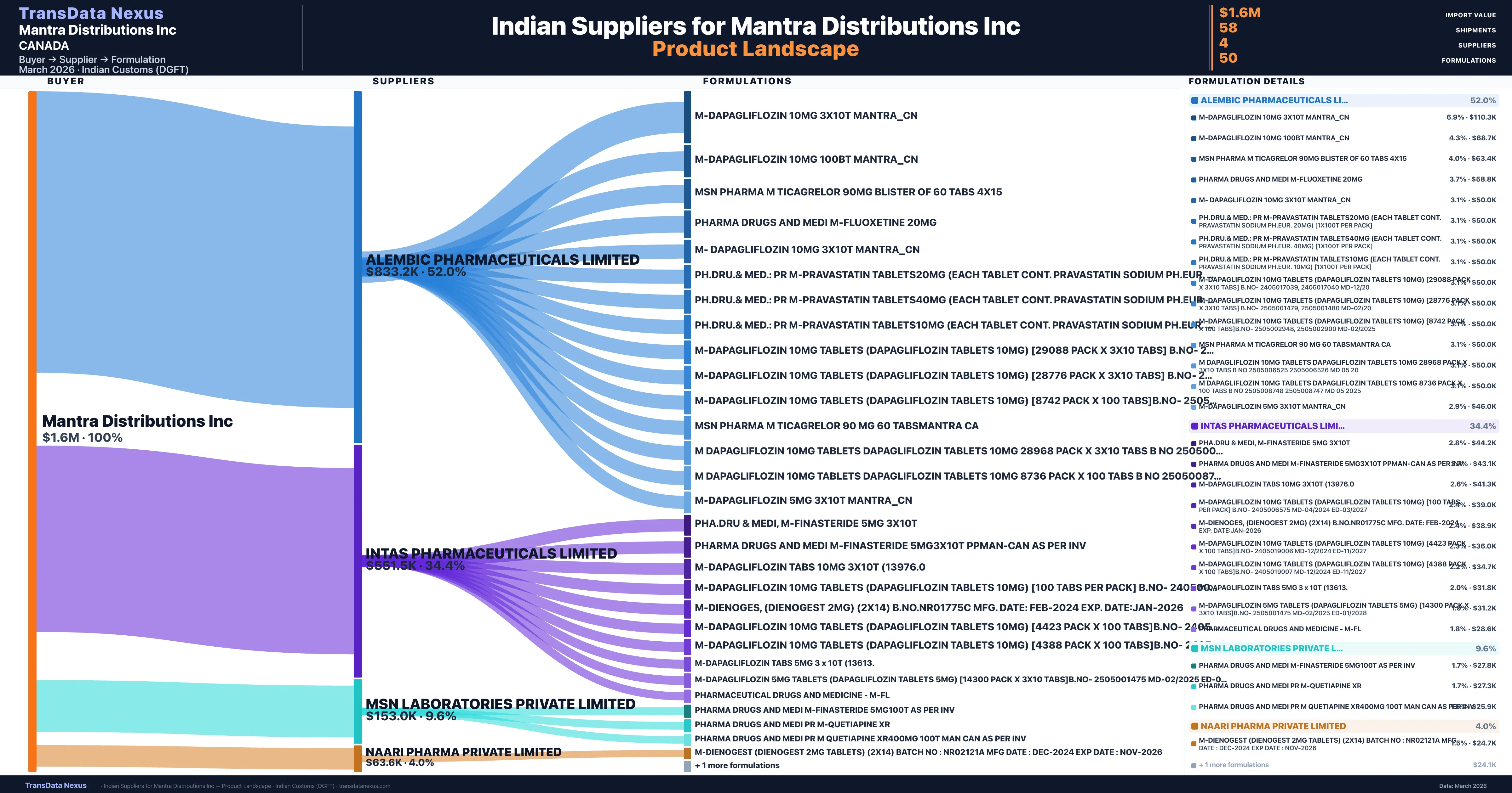 Mantra Distributions Inc sources from 4 verified Indian suppliers. The primary supplier is Alembic Pharmaceuticals Limited (52.0% of imports, $833.2K).
